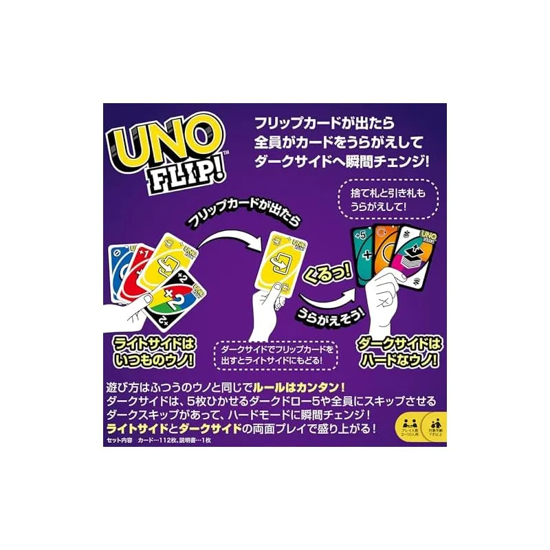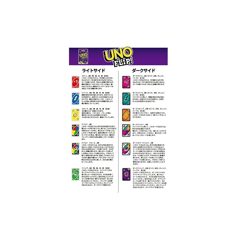 【商品概要】 ライトサイドとダークサイドの2つのサイドがあるUNO! 「フリップカード」を出すとダークサイドに突入! 「ダークフリップ」カードを出すと、ライトサイドに戻るよ! 対象年齢・・・7才以上 製品サイズ・・・W9.2*D1.9*H14.6cm 電池・・・不要