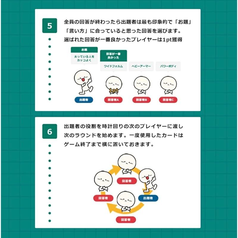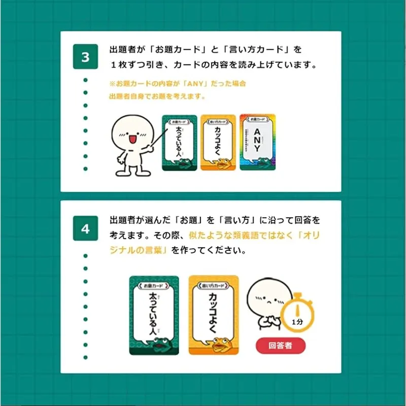 【商品説明】 『言いカエル』は、指定された言葉を“ユニークに言い換える”ことで、発想力とユーモアを競い合うエンタメ系カードゲームです。 たとえば「太っている人」を「かっこよく」言い換えるなら??「ワイルドフォルム」や「ヘビーアーマー」など、プレイヤーのセンスが光るアイデアが飛び交います。 既存の言葉にとらわれず、新しい言葉を創ることで、創造力・表現力・会話力が自然と育まれます。 家族や友達と一緒に、笑って突っ込み合いながら楽しめるのが本作の魅力。 また、自由度の高い「ANYカード」や点数制ルールなど、遊ぶたびに異なる展開が味わえる多彩なモードも搭載しています。 ただの言葉遊びでは物足りないあなたに。 “言い換え”を武器に盛り上がる、新感覚コミュニケーションゲームです。