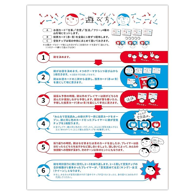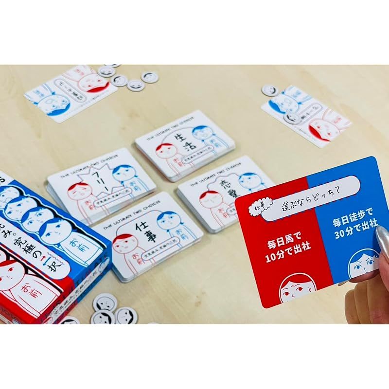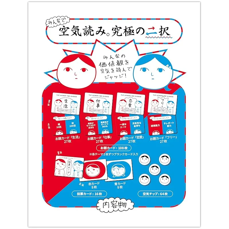 【商品説明】 どんなゲーム?:「みんなで空気読み。究極の?択」は親プレイヤーの選んだ究極の二択の選択を「空気を読んで」当てる、バランスゲームを題材としたコミュニケーションゲームです。わかりやすくシンプルなルールで、ボードゲーム初心者同士でもすぐに楽しめます。※TVゲーム版「みんなで空気読み。」とはルール、遊び方が異なります。 このゲームをプレイすることで相手の価値観(考え方)の理解度が深まり、友人関係、信頼度のUPに繋がること間違いなし!アイスブレイクなどにも活用できます!