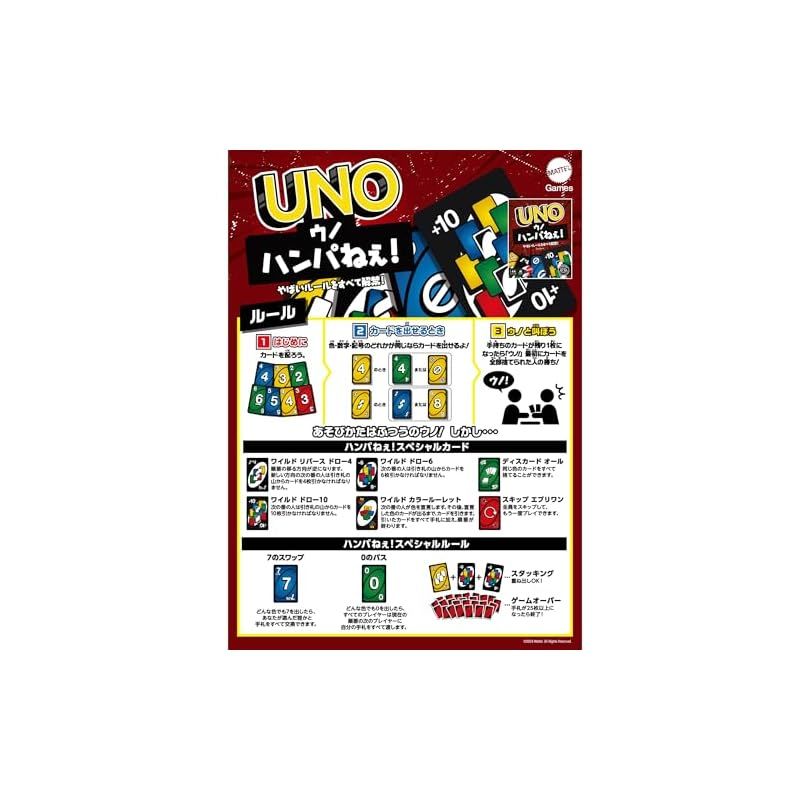 【商品詳細】 ブランド:Mattel Games 商品種別:マッチングカードゲーム 商品名:マテルゲーム(Mattel Game) ウノ(UNO) ウノ ハンパねぇ! カードゲーム パーティーゲーム 2~6人用 7歳から HWV18 製造元:Mattel GmbH 商品番号:HWV18 発売日:2024年04月20日 色: