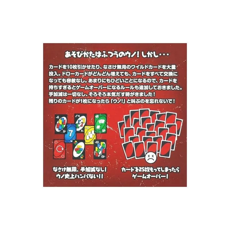【内容】カードを10枚ひかせるワイルドカードなど、情け無用のカードを大量投入。ドローカードがどんどん増えても、カードがすべて交換になっても、、、容赦なし!カードを持ちすぎるとゲームオーバーになるルールも追加。手加減なしのハンパない面白さ!