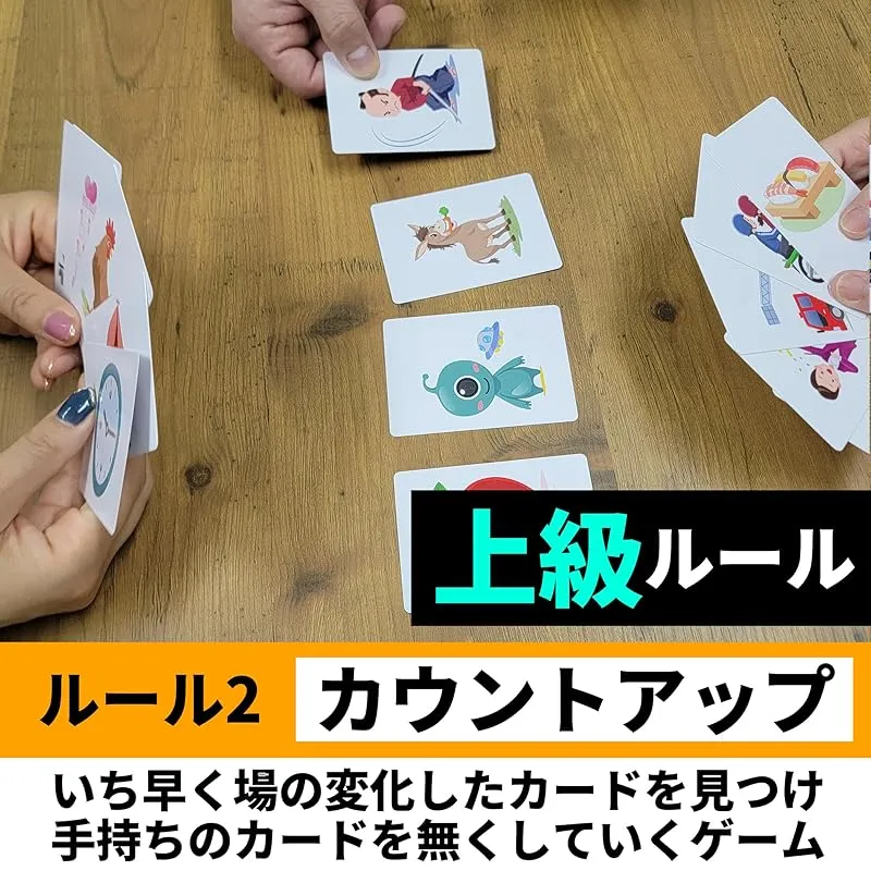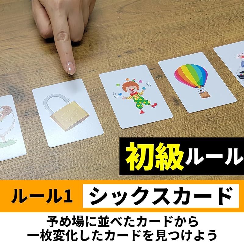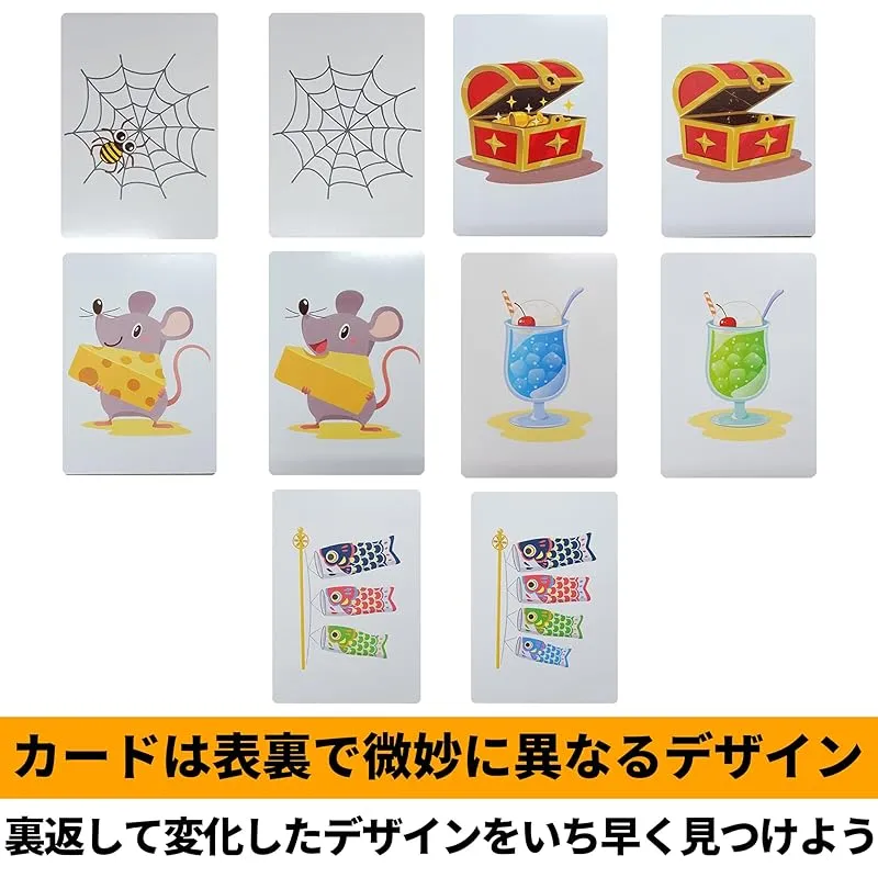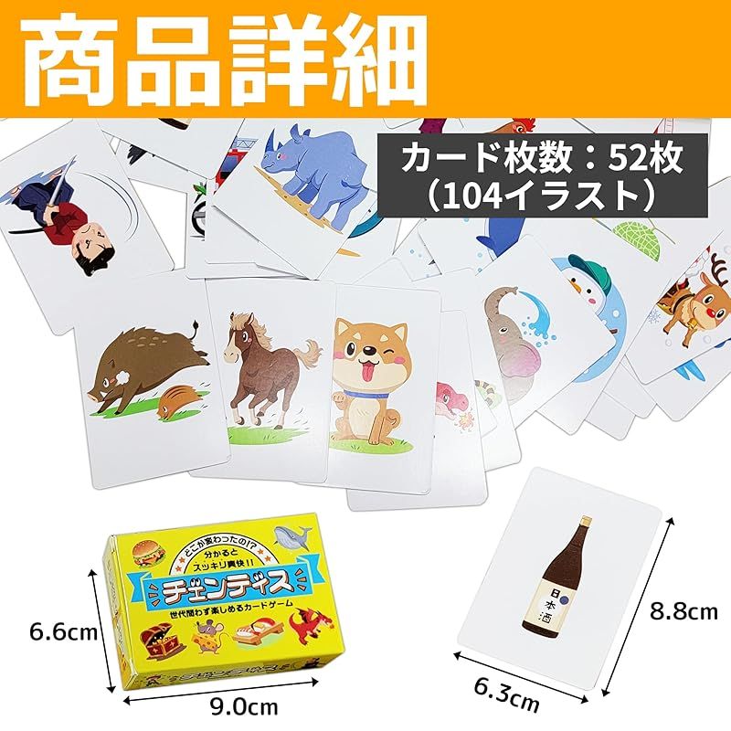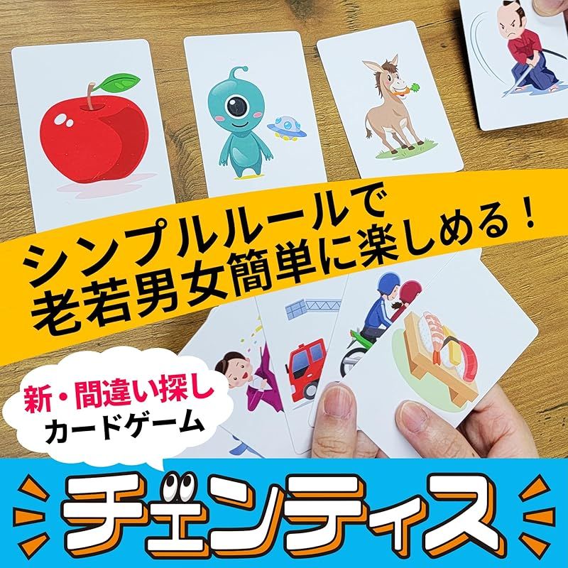 【商品概要】 新しい間違い探しゲーム:世界中で大人気の「どれがかわったの?」をベースにカード枚数の増量、日本人向けイラストへの修正や新ルールを設けた間違い探しゲーム「チェンティス」です。楽しみながらお子様の頭のトレーニングはもちろん、老若男女どなたでも楽しめるシンプルカードゲームです。 ゲームの特徴:全52種類のイラストカードが入っており、それぞれのカード表裏で少しイラストが異なるので(合計104イラスト)、小さな違いを見つけるゲームです。(どこが変わったかを見つける)詳しくは画像欄で遊び方を解説しております。 2種類の遊び方:ゲームは「シックスカード」と「カウントアップ」の難易度の異なる2種類の遊び方があり、難易度に合わせて楽しんだり、自分流にルールをカスタマイズ(より簡単にしたり、難しくしたり独自に調整)して遊ぶこともできます。 普通の間違い探しでは一度間違えポイントを覚えると飽きてしまいますが、このチェンティスは絵柄の種類が多いだけでなく、ルール上毎回絵柄の並びが変わるので、絵柄を覚えても容易には間違いに気づけないよう設計しており、飽きづらく長く遊べるようになっています。 間違い探しは一般的に記憶力や注意力、集中力を鍛えるのによいとされ、シニアの頭のトレーニングはもちろん、お子様の創造性・直感的思考・イメージ力・空間認識能力のトレーニングにも適しています。ただ鍛えると言ってもゲームが面白くないと続かないので、家族や友人と楽しく遊べることがこだわりです。