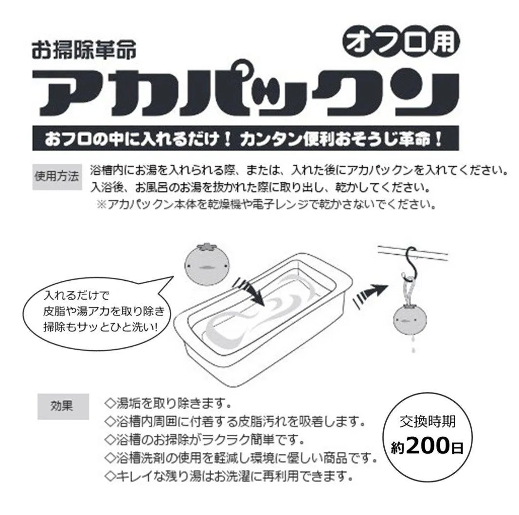 使用方法・浴槽内にお湯を入れられる際、または入れた後にアカパックンを入れて下さい。・浴槽からお湯を抜かれる際に取り出して下さい。