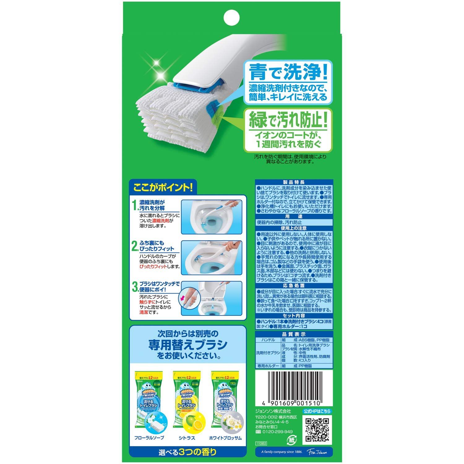 ●フローラルソープの香り。 専用ホルダーの使用方法 (1)台座部分の穴と背もたれ部分の2つのツメを合わせます。 (2)2つのツメを合わせたまま矢印の方向に3つ目のツメをカチッと音がするまで押し込みます。 (3)専用ホルダーを平らな所に置き、ハンドルを立てかけて保管してください。 流せるトイレブラシ付替用の使用方法 (1)点線に沿ってハサミでお切りください。ブラシが取り出しやすくなります。 (2)洗剤付きブラシを取り出します。ブラシは12個入っています。 (3)6個のブラシが1ブロックになっています。図のようにブラシを1コずつ切り離して使います。※ブラシは複数のシートを重ねたものです。ブラシが薄いとハンドルにブラシがはさめなかったり、使用中に外れたりすることがあります。 (4)洗剤付きブラシをハンドルに取り付けます。ハンドルの青いつまみを先端方向へ押すと、ハンドル先端のヘッドの先が広がります。ブラシを差込み、青いつまみを手元の方向へ引きます。この時、ブラシをしっかり固定するためカチッと音がするまでつまみを引いてください。 (5)水たまり部にブラシを2-3秒浸してから、便器内を洗います。青いつまみを先端方向へ押し、ブラシを便器内に捨てます。 ※使用後のブラシは燃やせるゴミとしても廃棄できます。 原材料・成分 界面活性剤、防腐剤 最後までご確認頂き誠にありがとうございました。 上記をご確認頂き、ご購入いただけましたら幸いです。 何かご不明な点がございましたらお気軽にメッセージからお問い合わせ下さい。