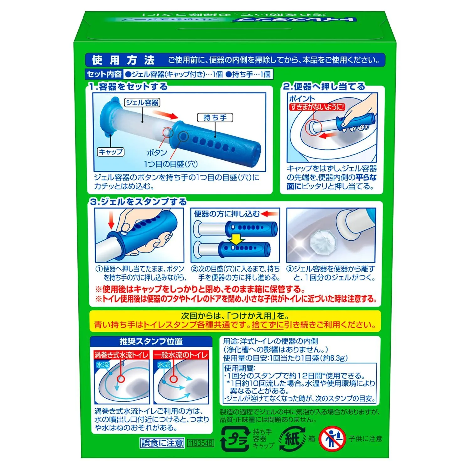 ●フレッシュソープの香り ※スタンプを押す際、便器と容器のすきまがないようにして押してください。 原材料・成分 界面活性剤(32% ポリオキシエチレンアルキルエーテル)、溶剤、香料 使用方法 使用方法/ ご使用前に、便器の内側を掃除してから、本品をご使用ください。 ?容器をセットする:ジェル容器のボタンを持ち手の1つ目の目盛(穴)にカチッとはめ込む。 ②便器へ押し当てる:キャップをはずし、ジェル容器の先端を、便器内側の平らな面にピッタリと押し当てる。 ③ジェルをスタンプする:①便器へ押し当てたまま、ボタンを持ち手の穴に押し込みながら、②次の目盛(穴)に入るまで、持ち手を便器の方に押し進める。③ジェル容器を便器から離すと、1回分のジェルがつく。 ※使用後はキャップをしっかりと閉め、そのまま箱に保管する。 ※トイレ使用後は便器のフタやトイレのドアを閉め、小さな子供がトイレに近づいた時は注意する。 用途/洋式トイレの便器の内側(浄化槽への影響はありません。) 使用量の目安/1回当たり1目盛(約6.3g) 使用期間/