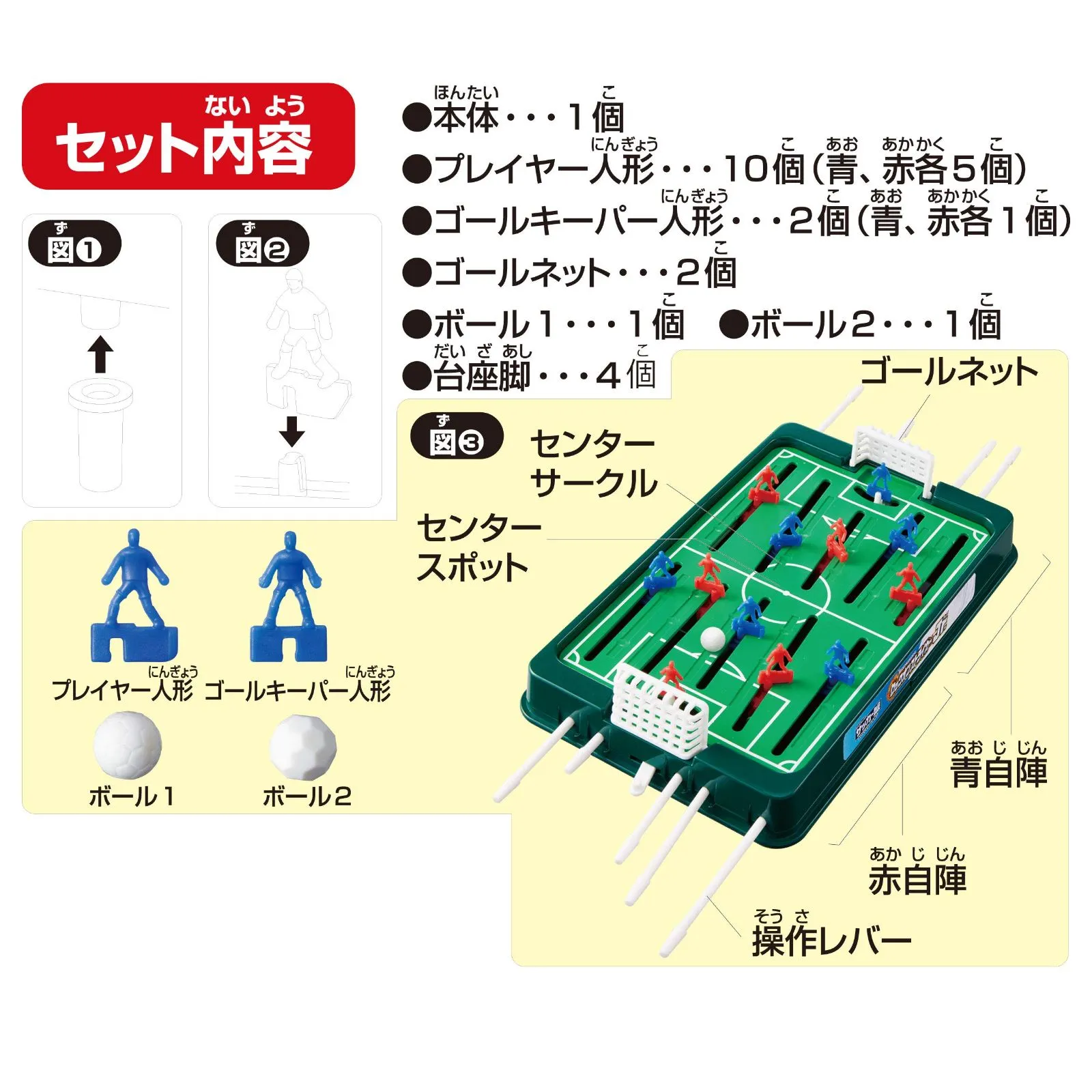 【セット内容】 スタジアム本体、フィールドプレイヤー人形(青・赤)x各5、ゴールキーパー人形(赤・青)x各1 ボールx2種、ゴールパーツx各2、台座脚x4 (より) 安全警告 なし 最後までご確認頂き誠にありがとうございました。 上記をご確認頂き、ご購入いただけましたら幸いです。 何かご不明な点がございましたらお気軽にメッセージからお問い合わせ下さい。