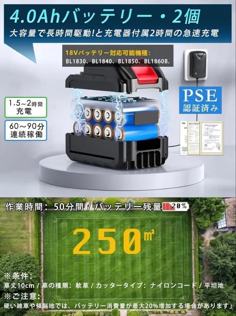 【革新1】電池革命:4.0Ah大容量で作業時間+60分→ 2.0Ah旧モデル比 1.5倍の連続稼働(200㎡の芝生が1回の充電で完了)