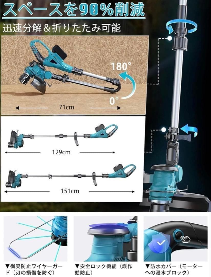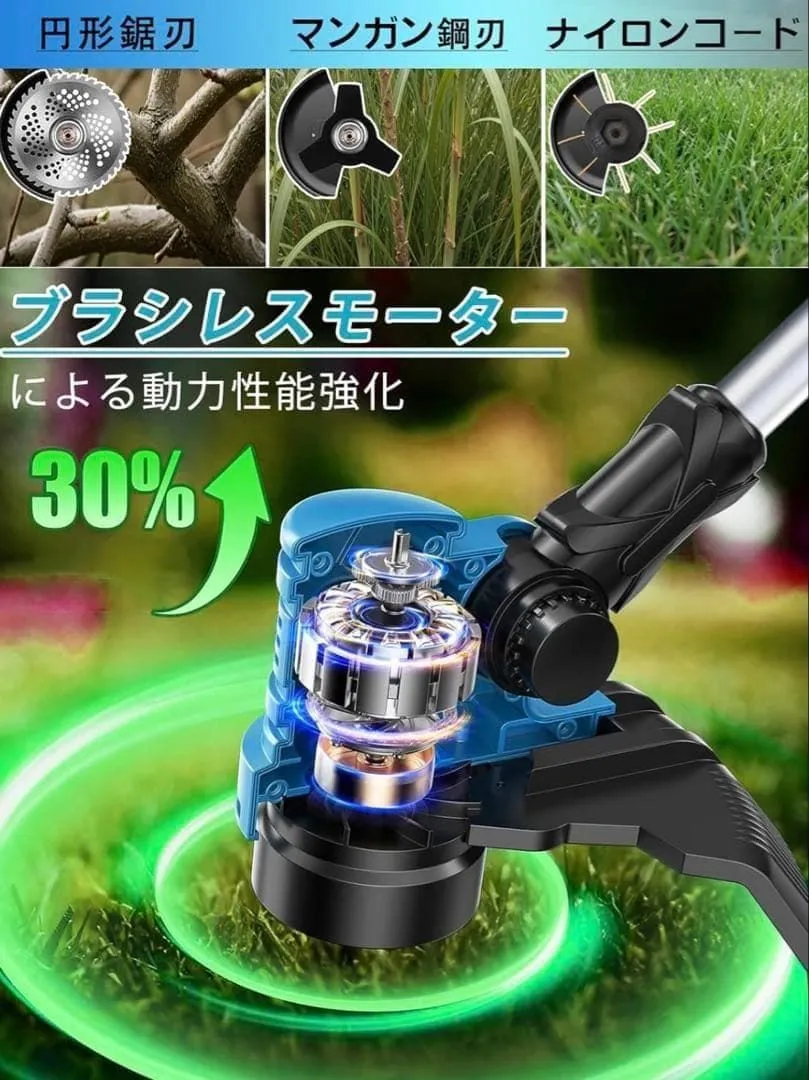 【革新2】純銅モーターの熱暴走ゼロ設計→ 高純度銅巻線(99.99%)で 熱効率+30%・寿命2倍 軽量折り畳み&安全設計▼電動草刈り機折り畳み時全長71cm(作業時129cm-151cm)の超コンパクト設計。1.8kg軽量で女性の片手運搬も可能。二重安全ロック(スイッチ+レバー)刃カバーで飛散防止62dB静音性で早朝作業OK→高齢者にも安心 草刈り機18Vバッテリー互換システム「BL1830B BL1840B BL1850B BL1860B等の18Vバッテリーに完全対応。継ぎ足し充電可能で自然放電しにくく、充電式草刈機屋外作業に最適。コードレス設計により電源制限なく広範囲をカバーします、コードレス草刈り機 充電式 の利点を活かした」 2個セット大容量バッテリー & スマート管理機能「PSE認証済み4.0Ahバッテリー2個付属で約1.5時間連続稼働。6段階保護機能(過充電/過放電/過電流/過電圧/温度/短絡)搭載。LEDディスプレイで残量を常時確認可能なインテリジェント設計です。草刈り機 充電式 安全な草刈機 として家庭/業務用に最適です。」 高出力ブラシレスモーター230mm広刈り幅「住宅地用草刈機 20cm大型丸ノコ刃採用で灌木や枝も容易に切断。25,000回転/分の高出力ブラシレスモーターが従来比30%出力向上&20%省電力を実現。排熱効率が良く全天候作業可能なうえ、騒音を最大20dB低減。灌木対応 草刈り機 の性能を実現。住宅地/商業施設でも安心してご利用いただけます。静音草刈機 です。」最長15年使用可能. O13039 $$8500