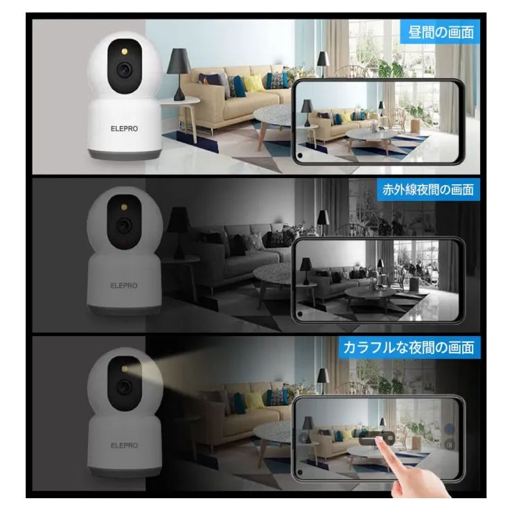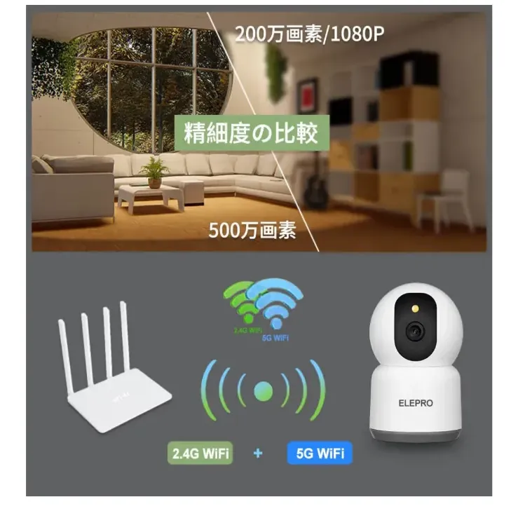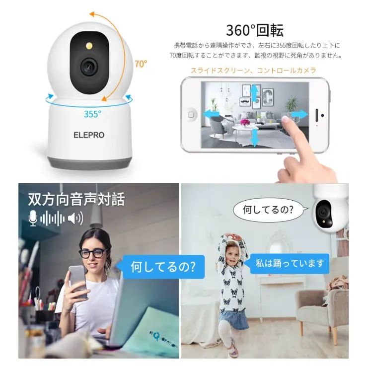 対応】ELEPRO ペットカメラ 見守りカメラ (1080Pや400万画素より鮮明 2.4Gよりスムーズ カラーナイトビジョン PTZ 自動追尾 スマホで見れる 動体検知 プッシュ通知 音声やライト警告)防犯カメラ セキュリティカメラ