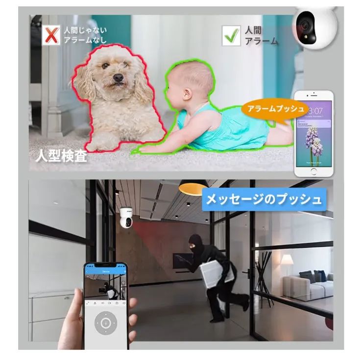 【仕様】 センサー: 1/2.7 インチ、5 メガピクセル プログレッシブ スキャン CMOS レンズパラメータ: 焦点距離: 4mm、5MP、スターライトレンズ 画角:水平:80°、垂直:58°、対角:110° 録画記録規格:HDモード(1920P:2560*1920) / SDモード(360P:480*360) リアルタイム視聴解像度:1920P、1440P、720P、360P(デフォルト) 画像フレームレート: 15fps 夜間視認性: ナイトビジョン IR Max10 メートル パン&チルト:パン:355°、チルト:70° トラッキング: AI 自動モーション トラッキング 動体検知距離:8〜10メートル(使用環境によって変わります) アラーム通知:アラーム通知をスマートフォンにプッシュ ワイヤレス: 2.4G (11 b n g) 混合 & 5G 11a/n/ac 混合、WEP、WPA & WPA2 暗号化をサポート、 Wi-Fi6やIPv6/IPv4をサポート アプリ: iOS /Android (SriHome APP) 録画モード: モーション検知アラーム録画、7/24 常時録画 再生: APPでmicroSD カード記録再生、PC でmicroSD カード記録再生 製品タイプ: 屋内用、-10°C ~50°C 製品情報: N.W.190g、商品サイズ: 70 * 70 *115 mm (LxWxH)、入力電圧:5V(1A/ 1.5A/2A)、DCポート仕様電源ケーブル:1.5m 雄側のケーブルの中の芯仕様内径:1.5mm 外径:3.5mm (3メートルまでの延長ケーブルに対応していますが、純正以外の品質の低いケーブルを使用すると、給電に問題が生じる場合があります)