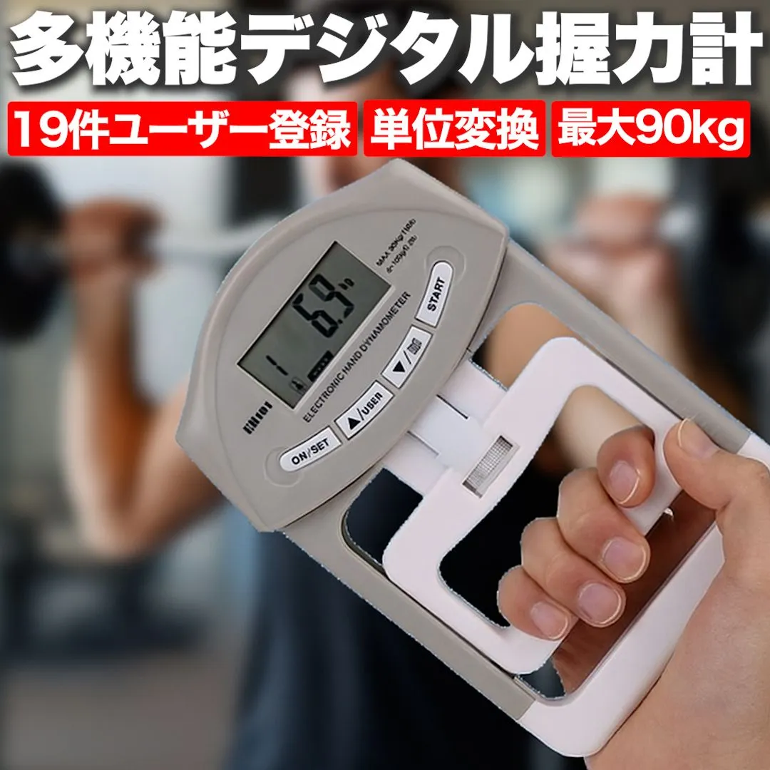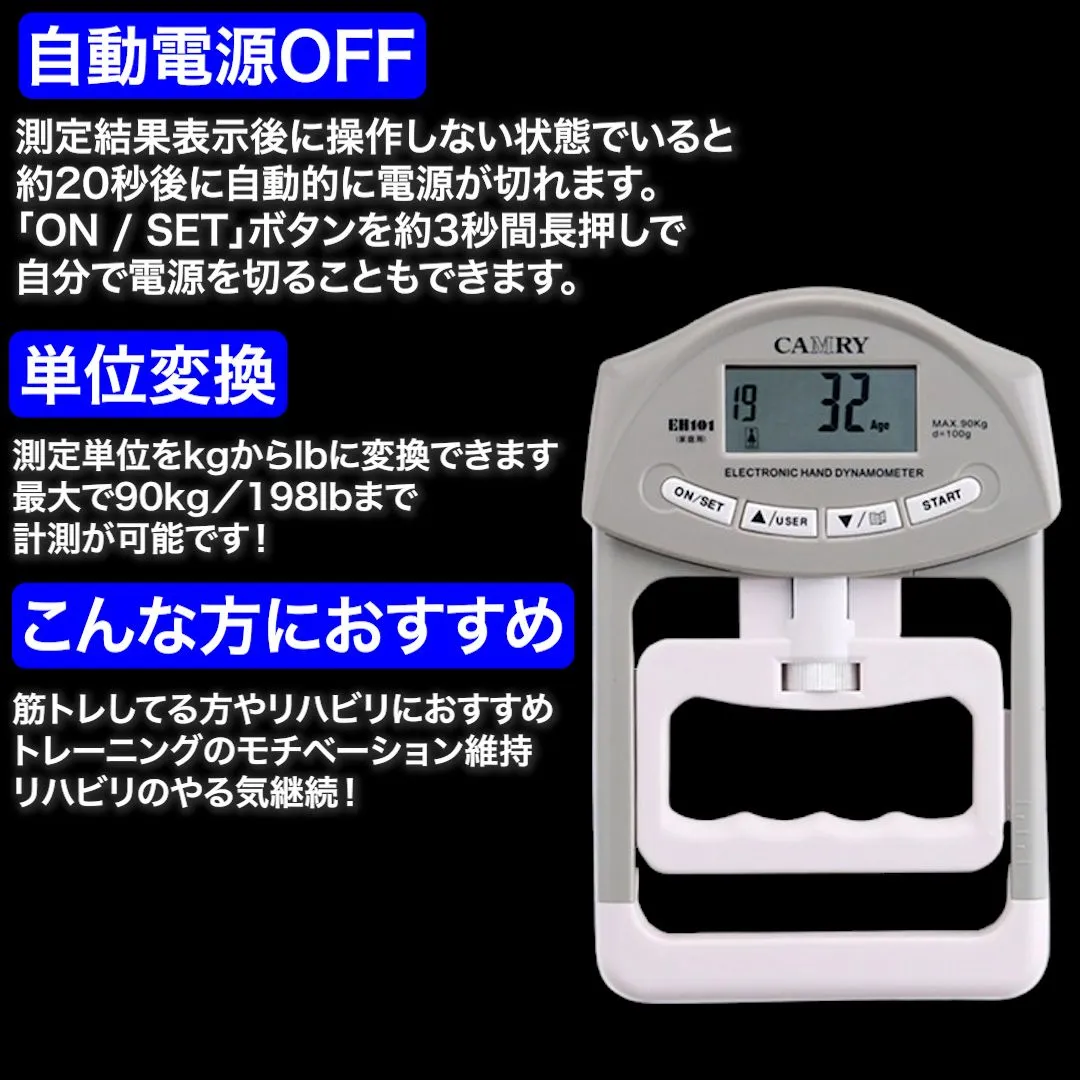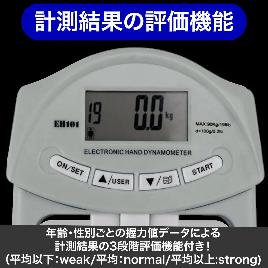 ●主な特徴 ・健康診断や自宅リハビリに最適 ・19名分のユーザー登録が可能 ・握り幅を調整でき、手の大きさにフィット ・測定結果は3段階で評価表示 ・前回とのUP/DOWNもわかりやすく表示 ・kg ⇄ lb の単位切替対応 ・日本語説明書付きで届いてすぐ使える