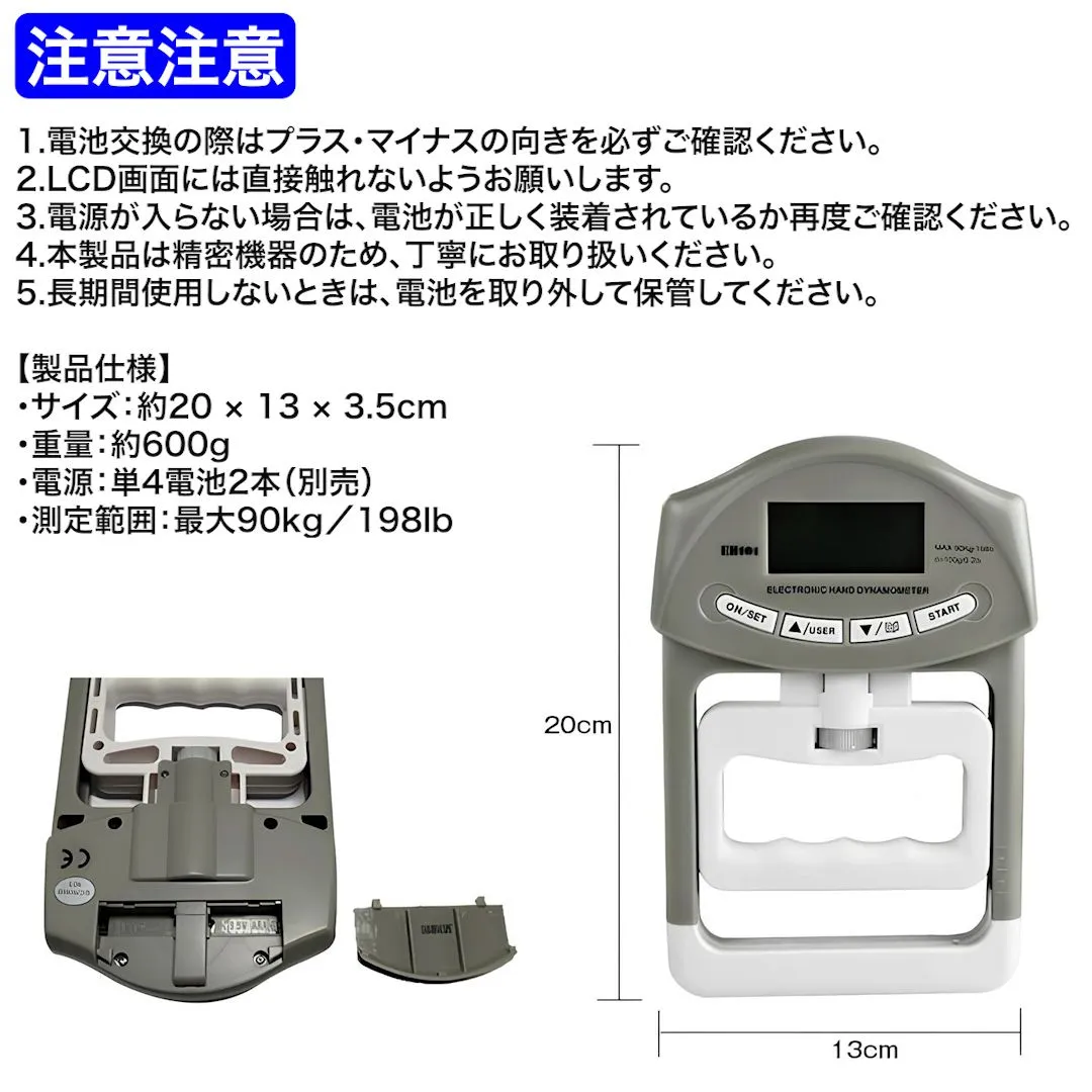 ●仕様 ・商品内容:握力計 ・サイズ:約20cm × 13cm × 3.5cm ・重量:約600g ・電源:単4電池×2(別売り) ・測定範囲:最大90kg / 198lb