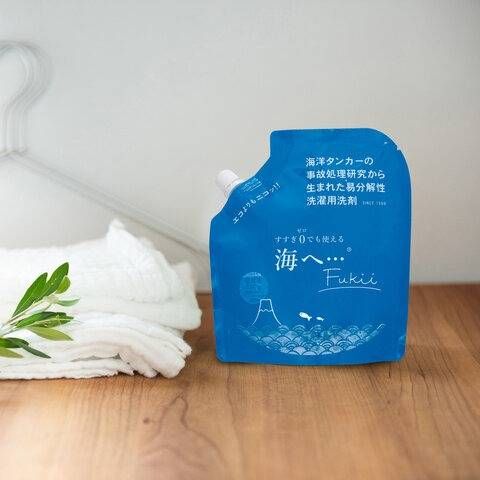 すすぎゼロで使える、人と環境に優しい洗濯洗剤『海へ…Fukii』。 ‘ラベンダー精油’ を使っていて、洗濯・食器洗い・お掃除用洗剤と多目的に使えます。
