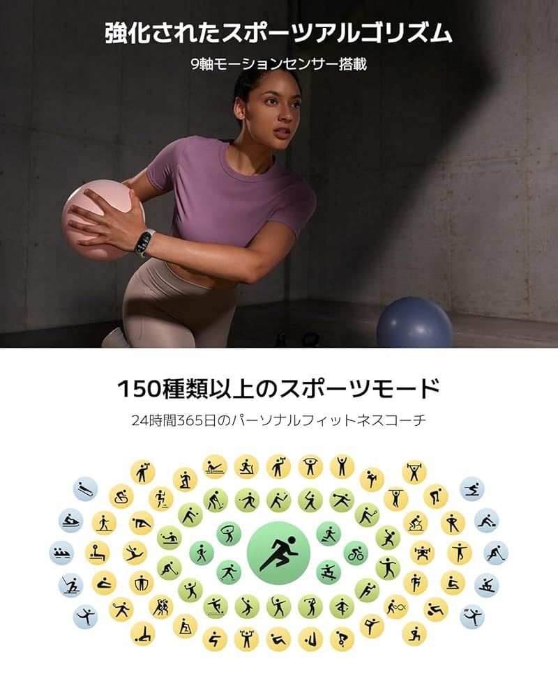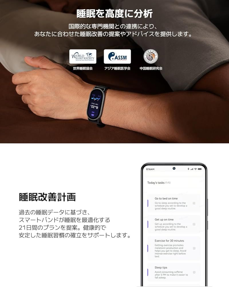 【睡眠モニタリング2.0】入眠・覚醒の検出精度が前世代より向上し、特に「検出の安定性」や「低活動時の誤記録の低減」が強化されました。毎日・毎週・毎月の睡眠データを整理し、わかりやすいレポートとして表示。過去の睡眠データに基づき、国際的な専門機関との連携により、あなたに合わせた睡眠改善の提案やアドバイスを提供します。さらに、血中酸素飽和度やストレスなどの24時間モニタリングにも対応しており、日常の健康管理を総合的にサポートします。
