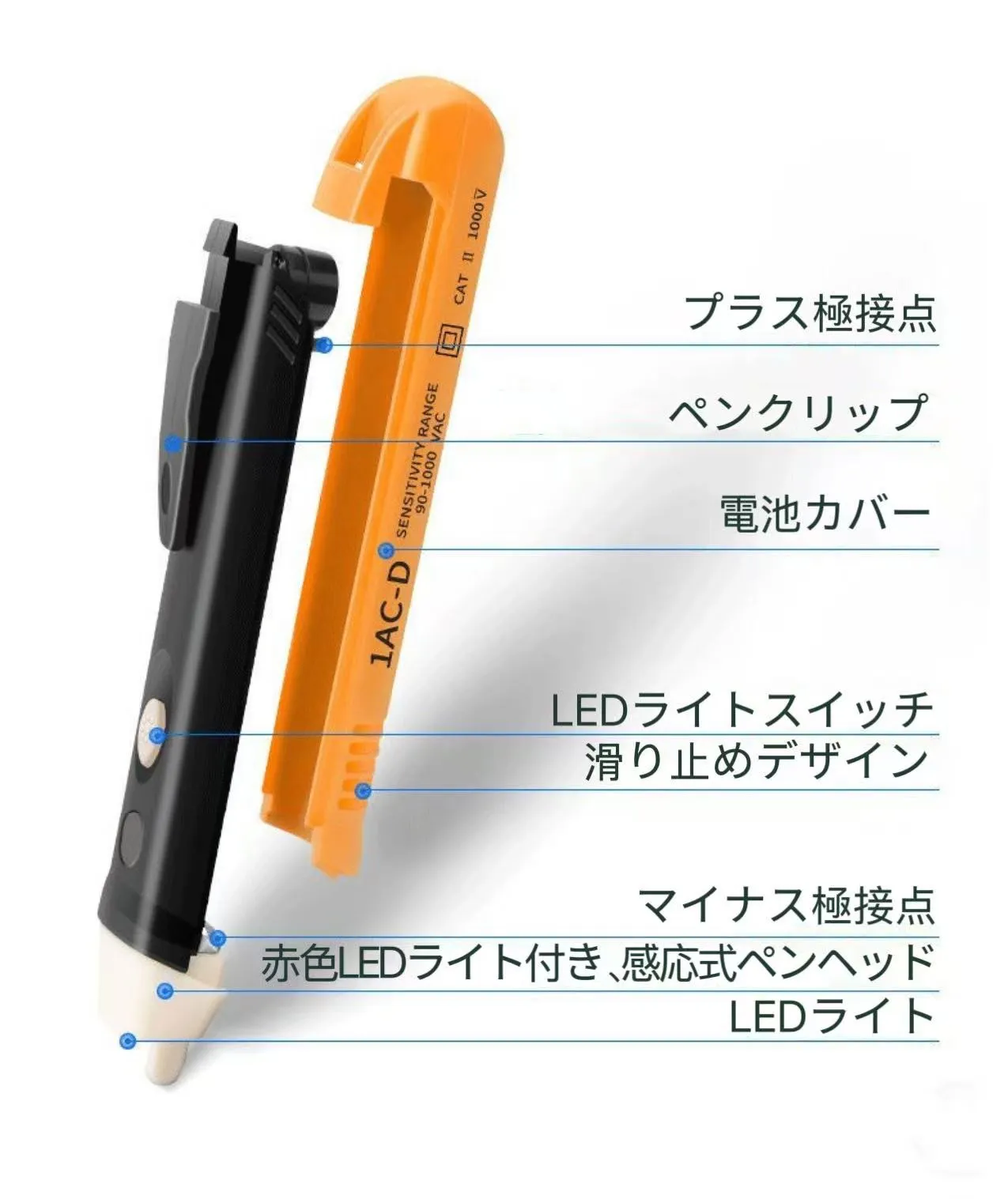 非接触検電テスターペン、AC90V-1000V、音と光で通電をお知らせ