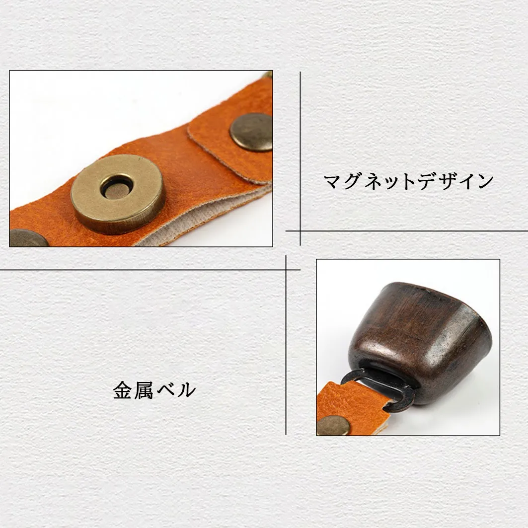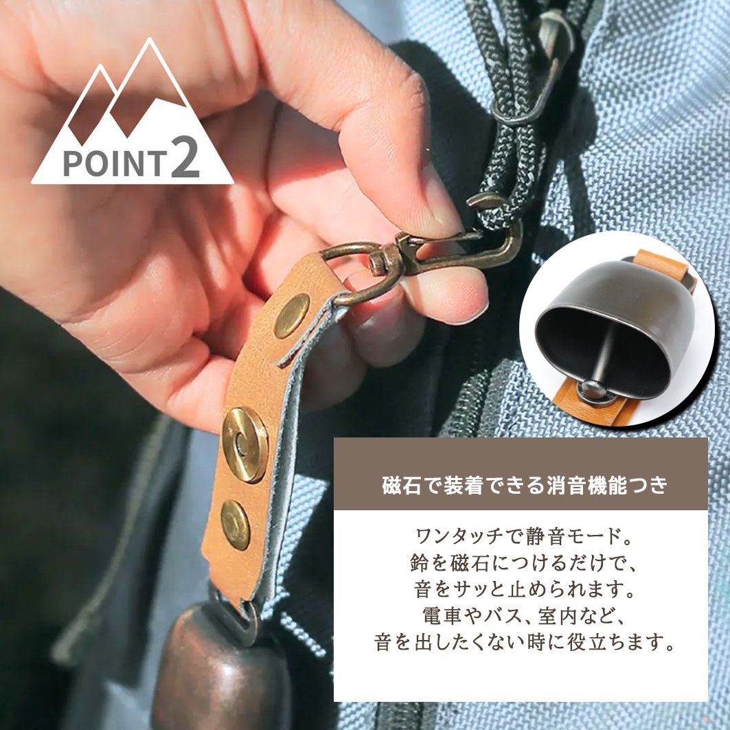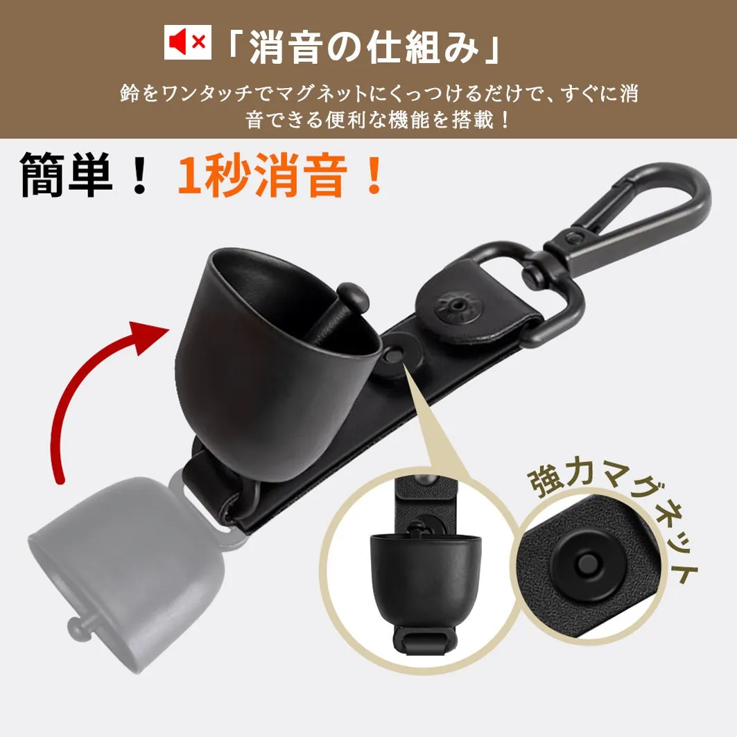 【消音機能付き】 磁石で鈴をとめるだけの簡単ワンステップ消音。 室内や移動時など、あまり音を鳴らしたくない時に手軽に消音にすることができます。 ※いざという時即座に使えるように消音機能用の磁石の磁力は弱めのものを採用しております。 衝撃が加わった際や使用用途、着ける位置によっては磁石が外れ音が鳴ってしまう場合がございます。 より確実に消音にしたい場合は鈴の内側にティッシュを詰めるなどの方法がおすすめです。