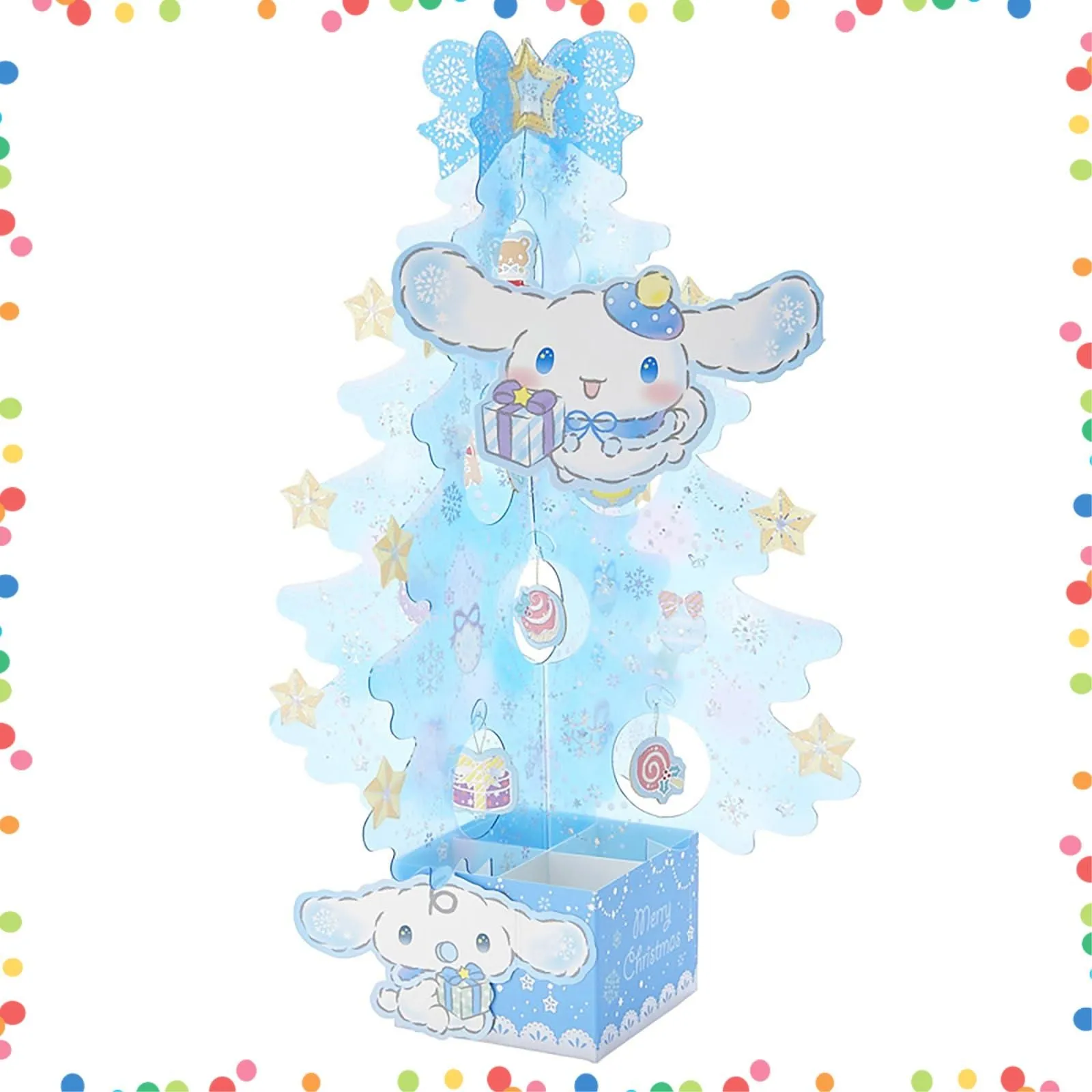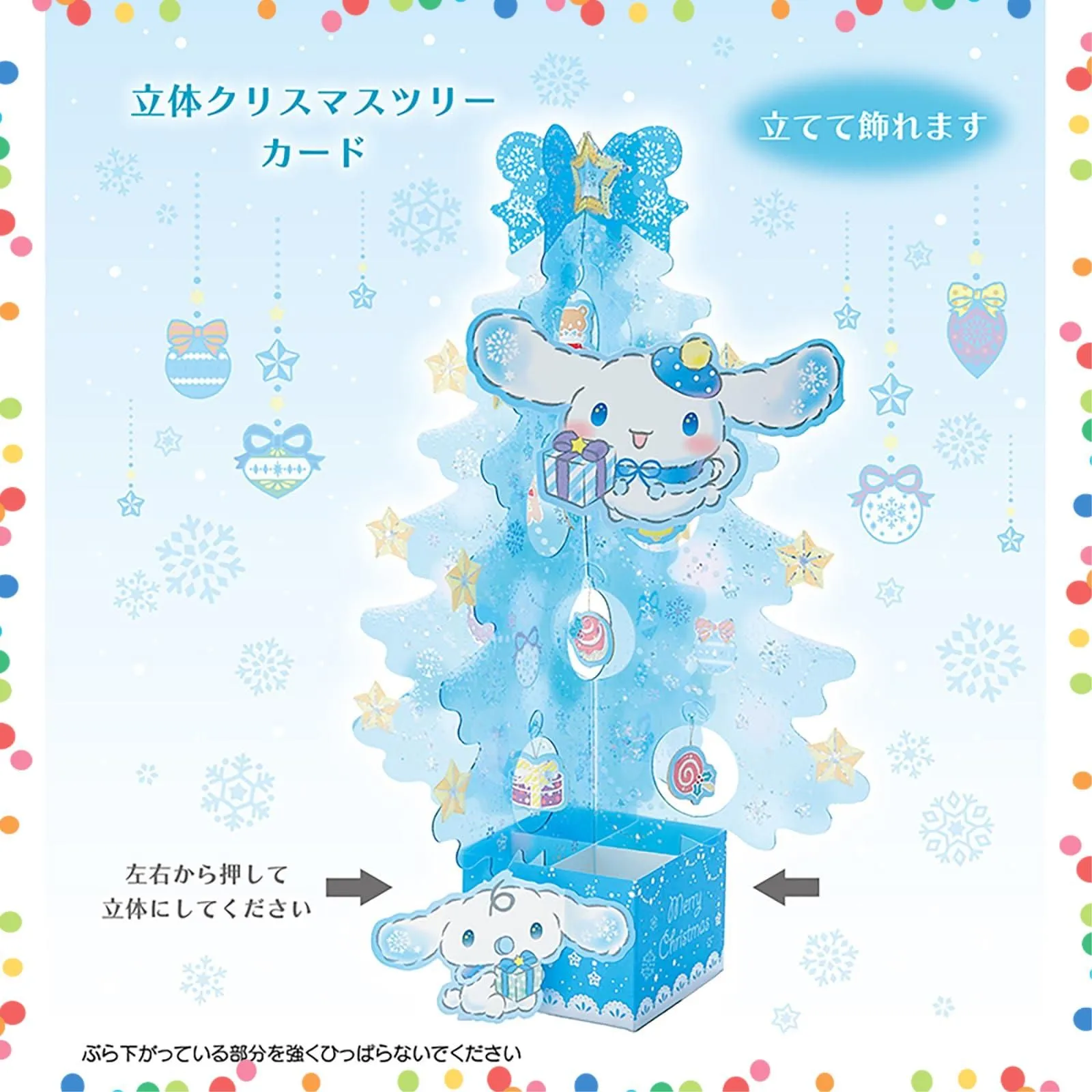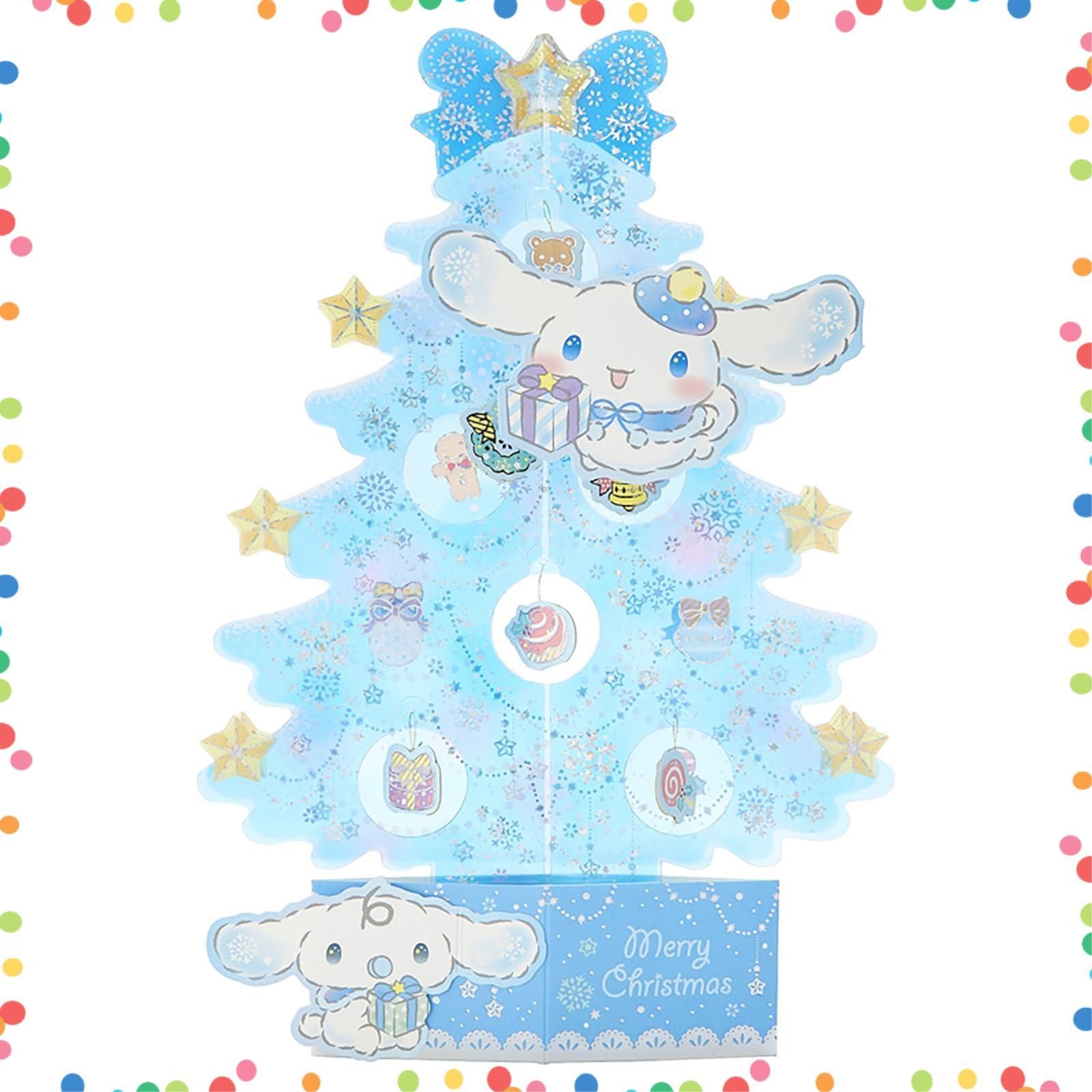 小さなオーナメントがゆらゆら揺れる、シナモロールの立体クリスマスツリーカードです。