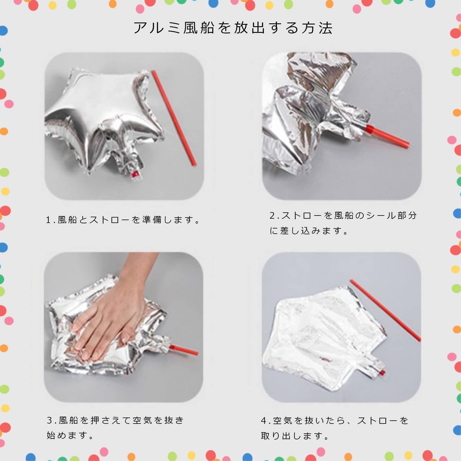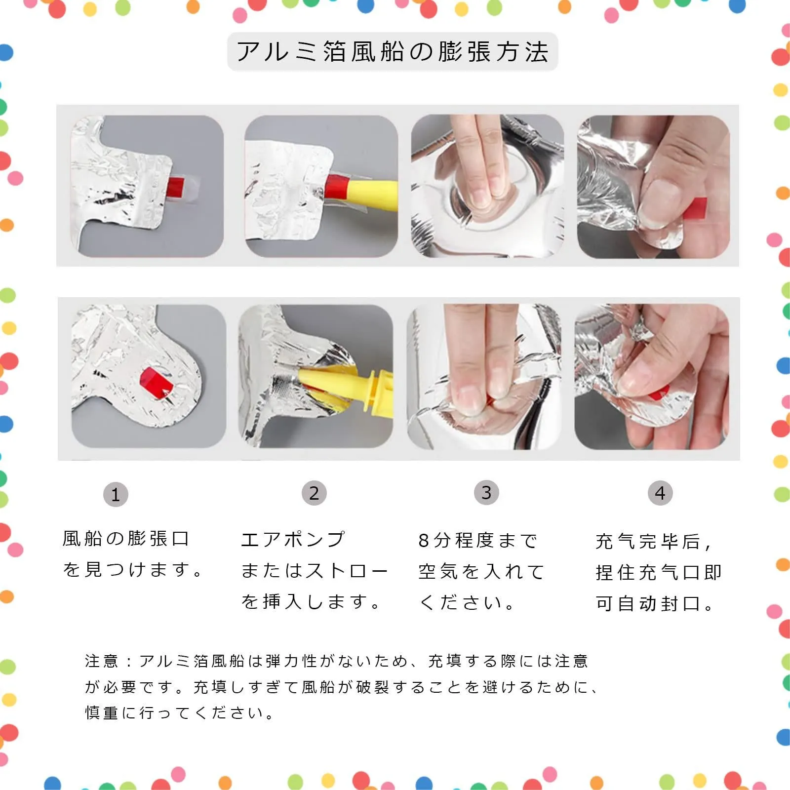 使用方法: 風船の口にストローや空気入れを差し込んで空気を入れてください。 逆止弁が付いているので膨らませたら空気は抜けないようになっております。 注入口は接着されておりストローやハンドポンプが挿し込みにくい場合がございます。 その場合はゆっくり少しづつ押すようにストローを注入口に挿し込んでください。