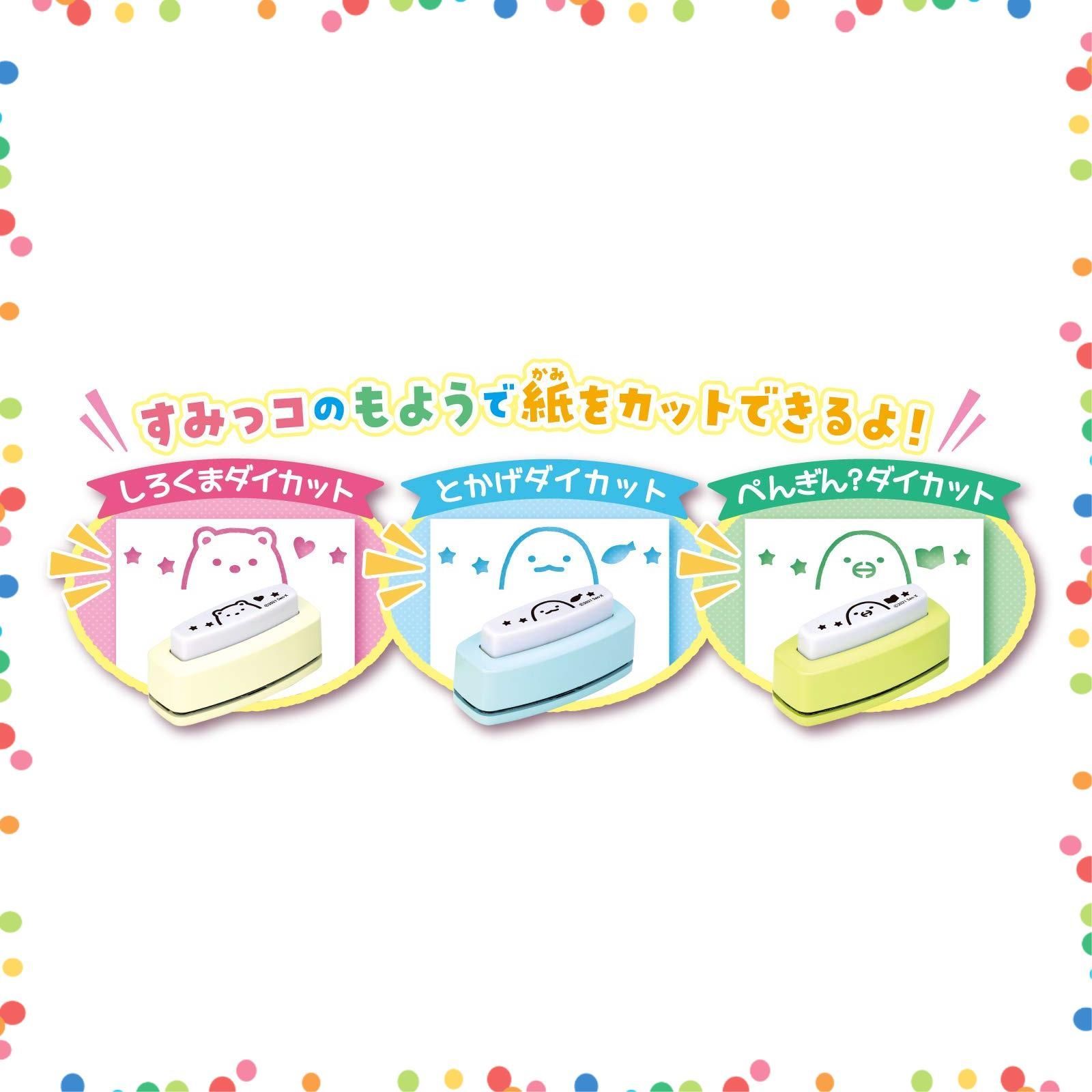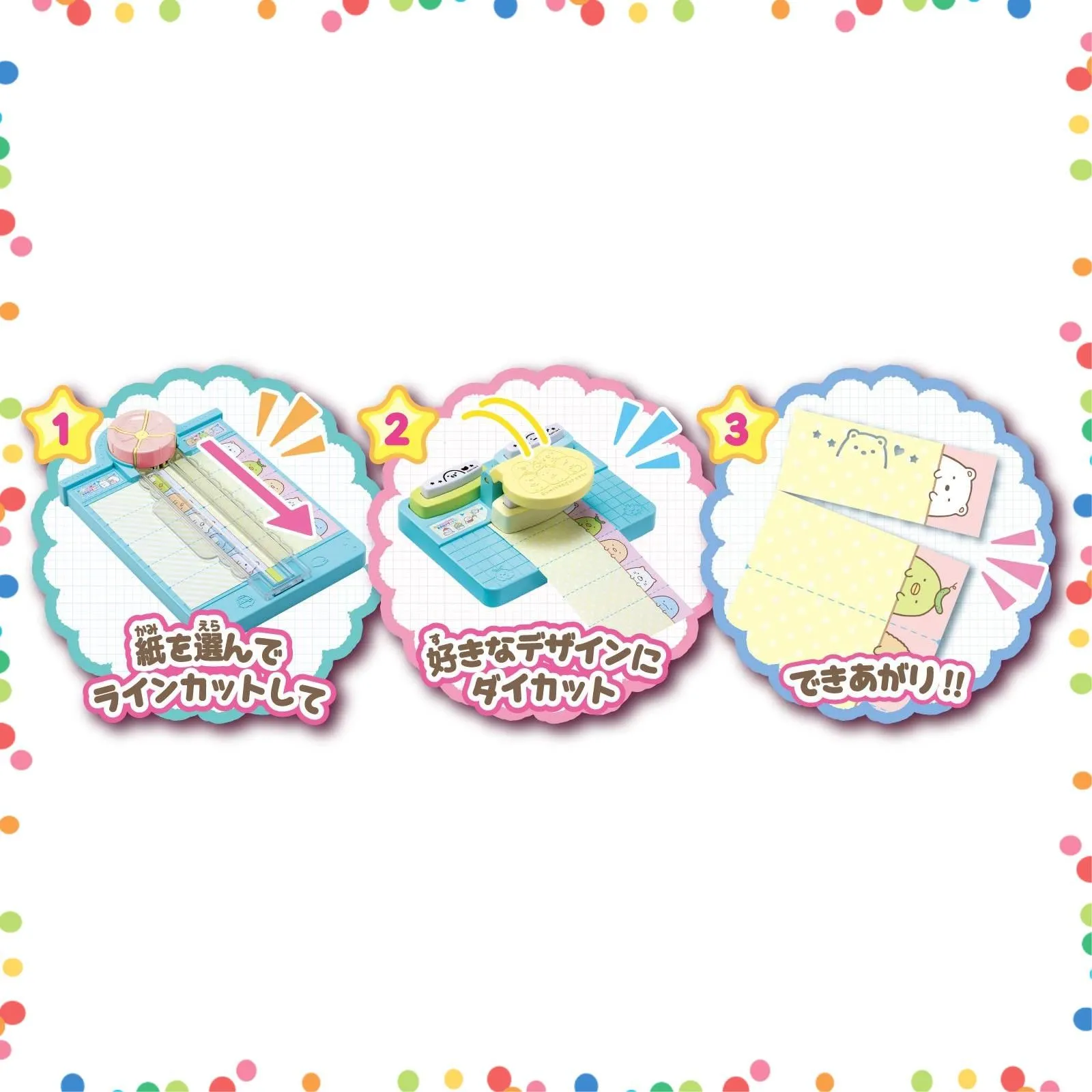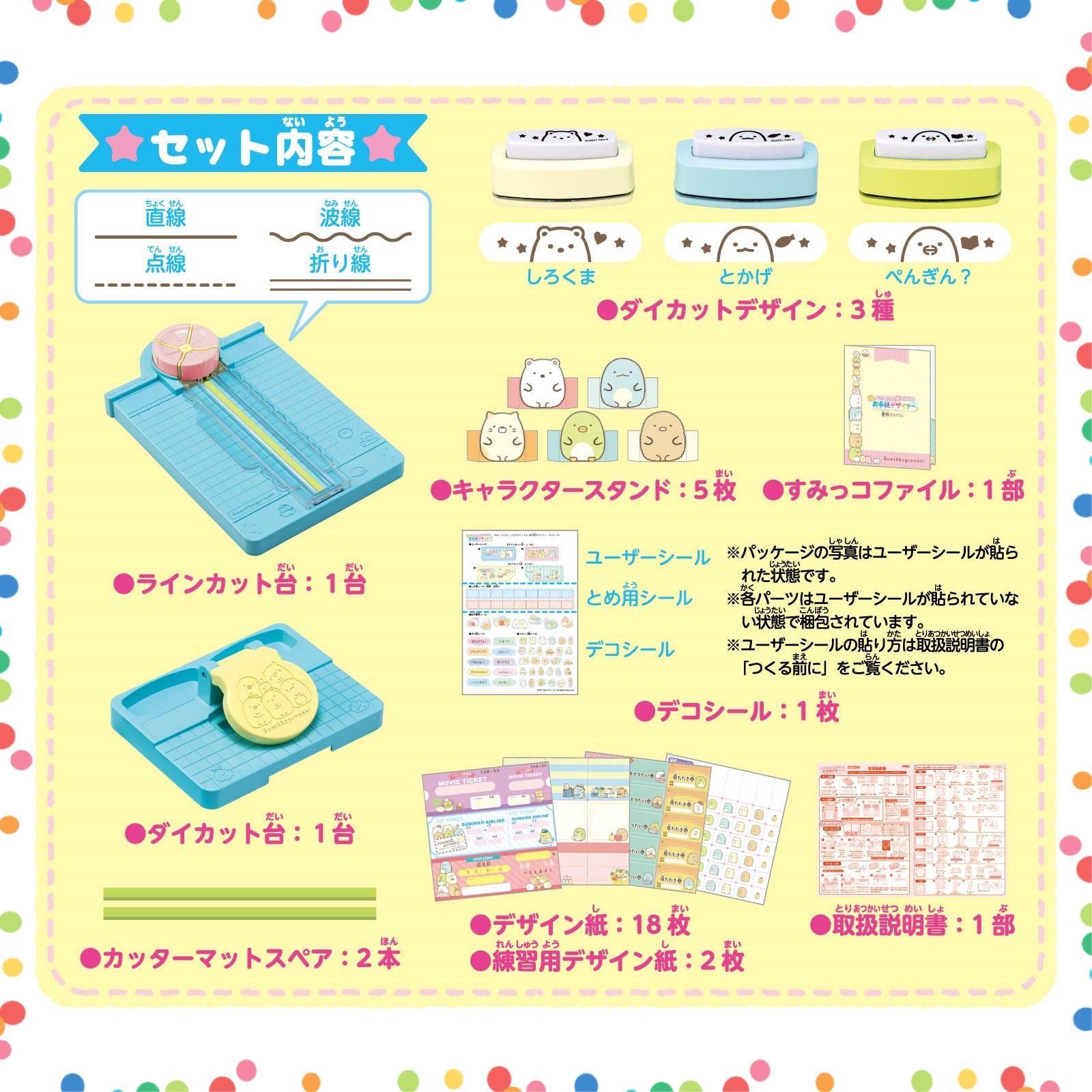 【遊び方】 付属のデザイン紙で「すみっコぐらし」のステーショナリーグッズが簡単に作れるセットです。 1作りたいデザイン紙を選び「ラインカット台」でカットしたり折り線をつけたりします。 2ラインカットしたら、すみっコキャラの顔に抜ける3種類の「ダイカットデザイン」から好きなものを選んで「ダイカット台」でダイカットします。 3ダイカットが終わったらお手紙やメモに組み上げて出来上がりです。 ※付属の「すみっコファイル」や「キャラクタースタンド」で飾ってもかわいいよ