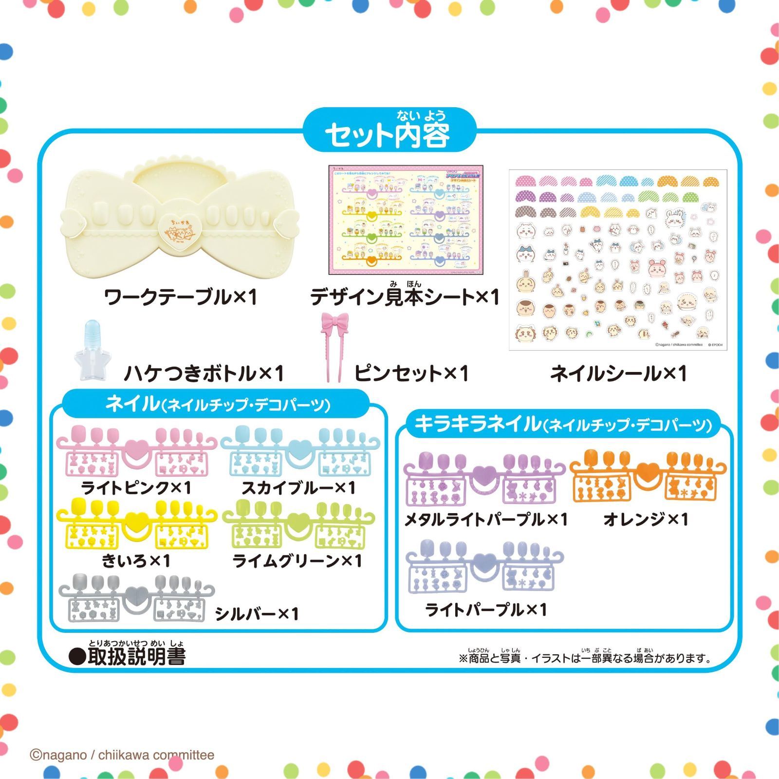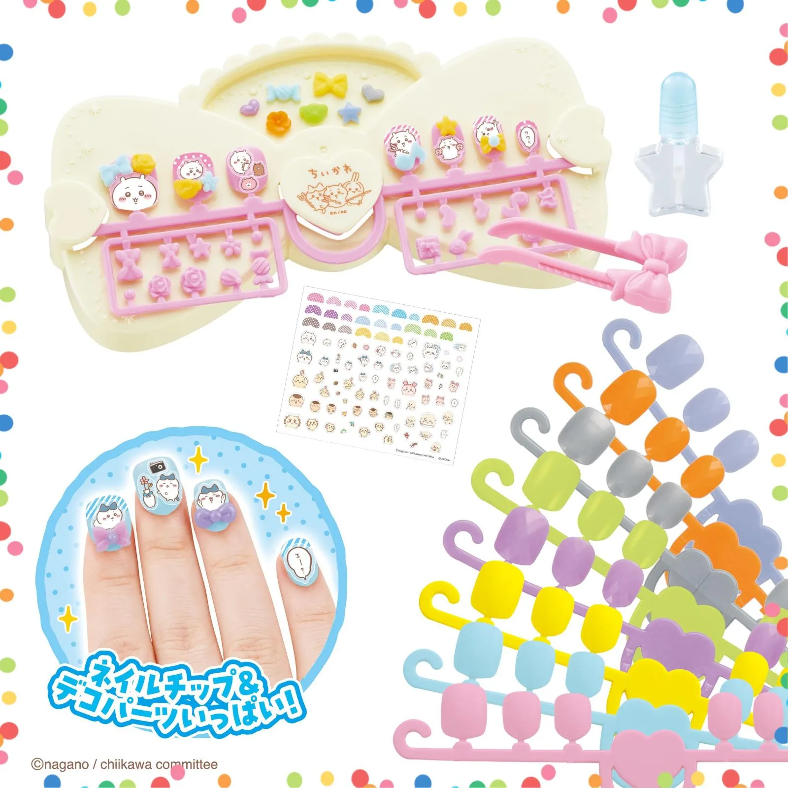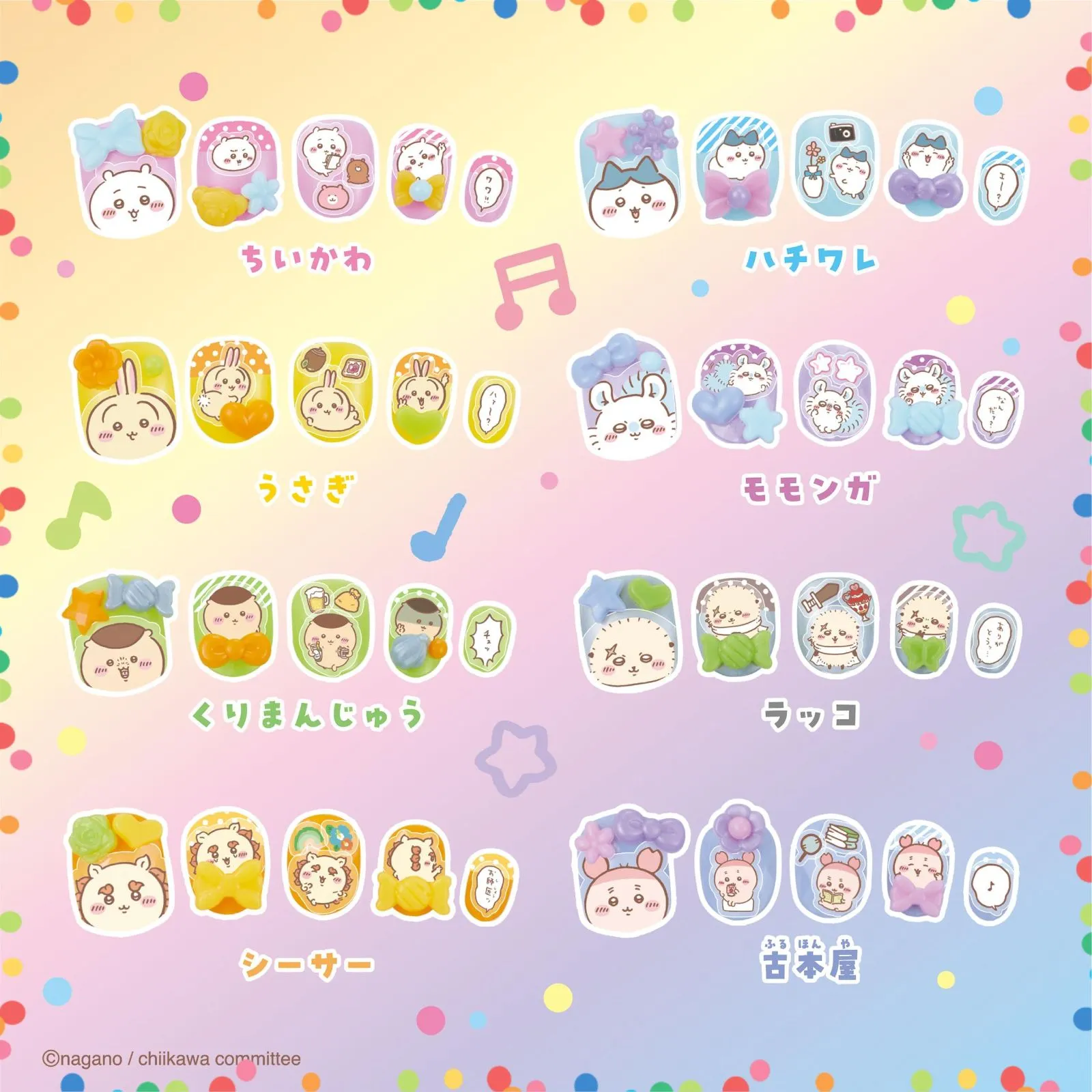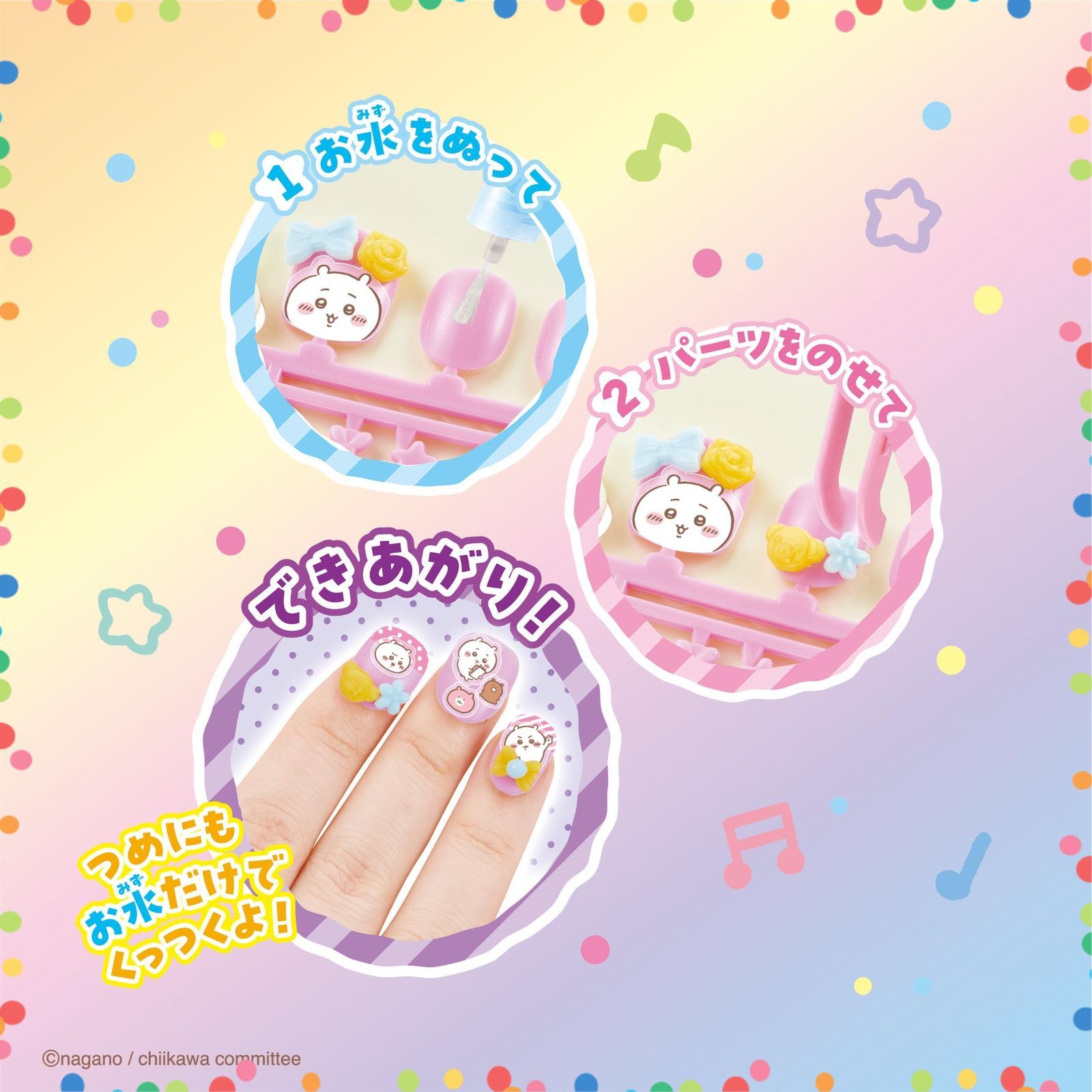 ●お水をぬってデコパーツをのせるだけ!色とりどりのネイルチップ、たくさんのデコパーツとかわいいネイルシールで、ちいかわたちのデコネイルがつくれます。