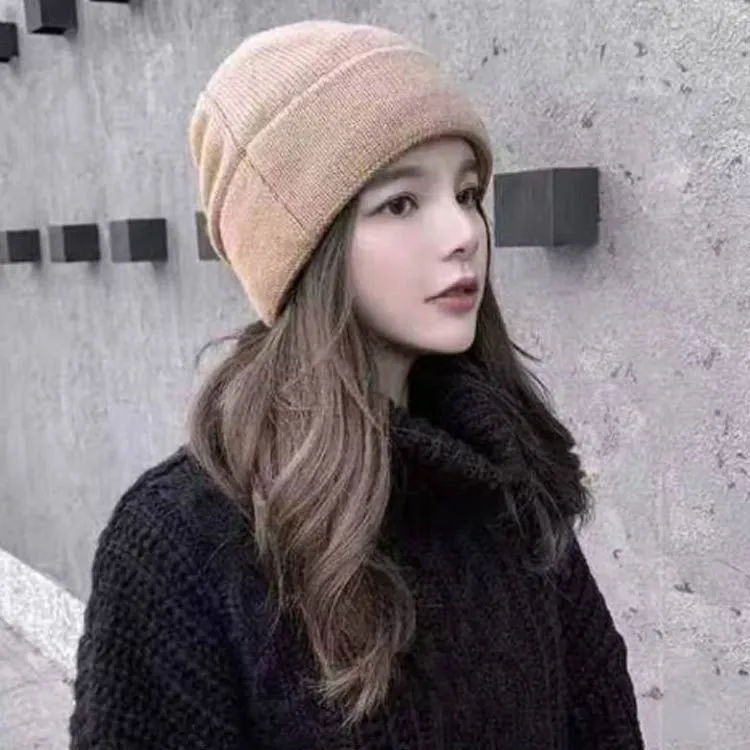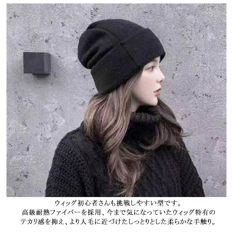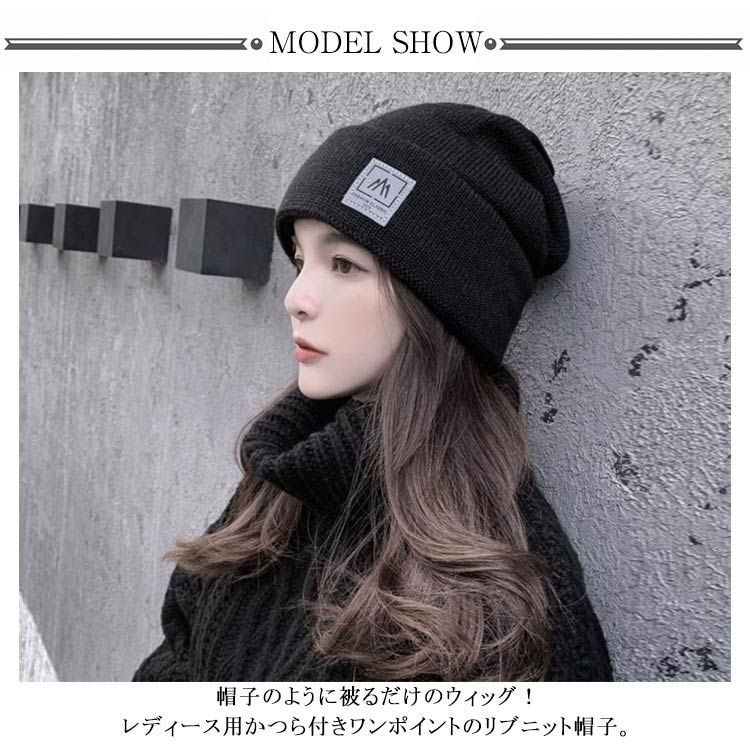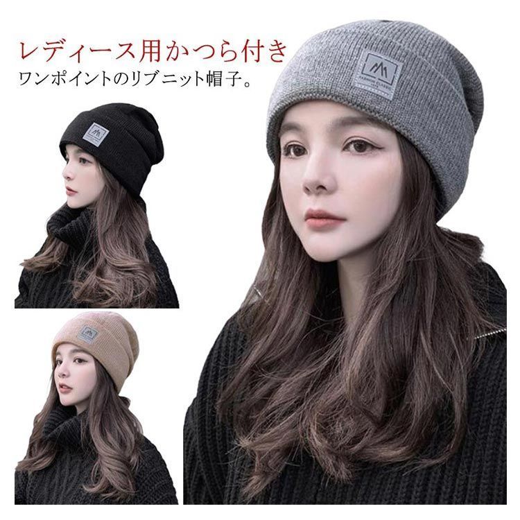 帽子のように被るだけのウィッグ!レディース用かつら付きワンポイントのリブニット帽子。