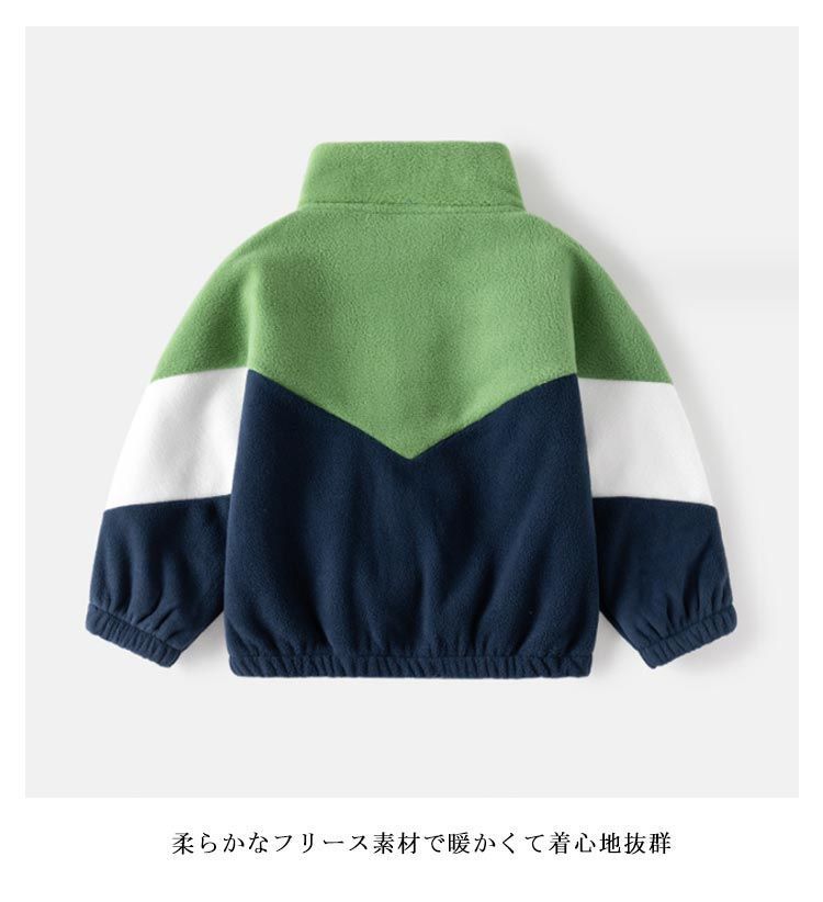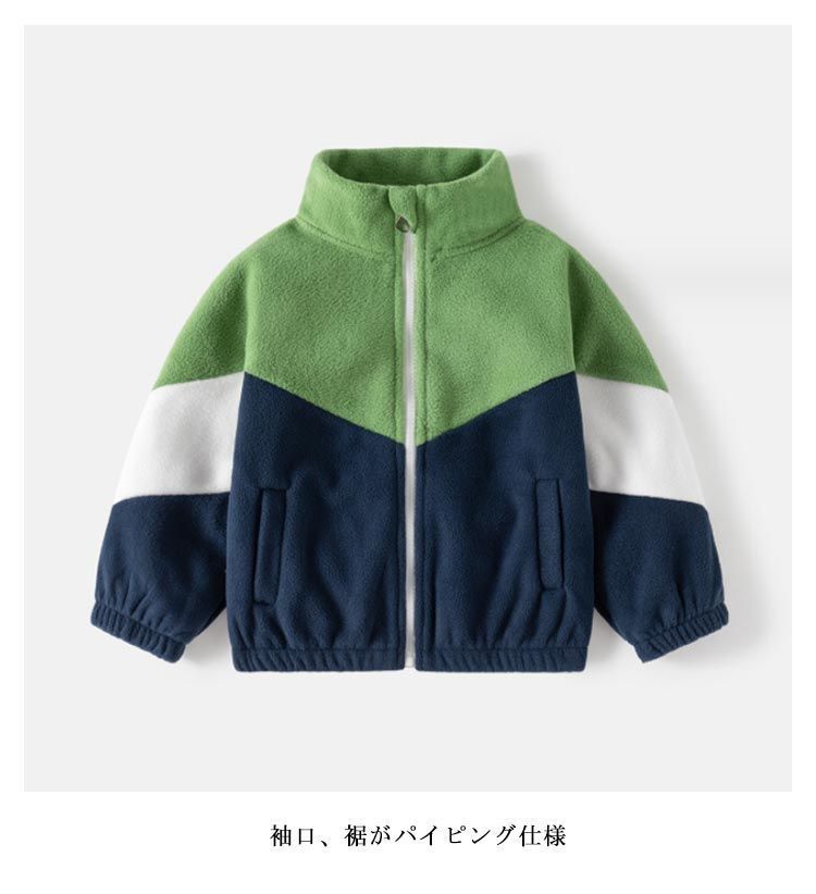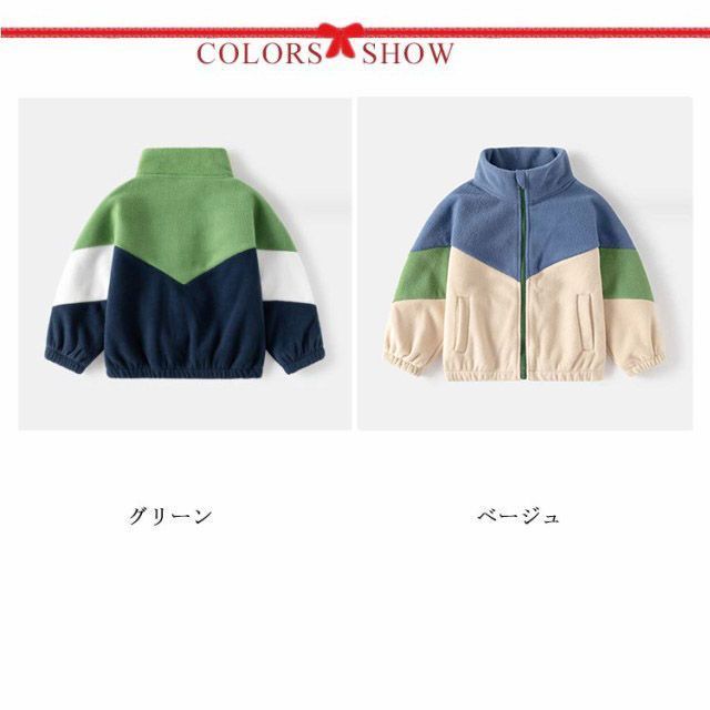 【130】トップス寸法:着丈50cm 袖丈51cm 身幅47m 素材:ポリエステル 色:ベージュ グリーン 子供用フリースジャケット 袖口、裾がパイピング仕様 柔らかなフリース素材で暖かくて着心地抜群 普段着はもちろん、公園、遊び、ルームウエア、通学、通園等、沢山シーンでご利用頂けます