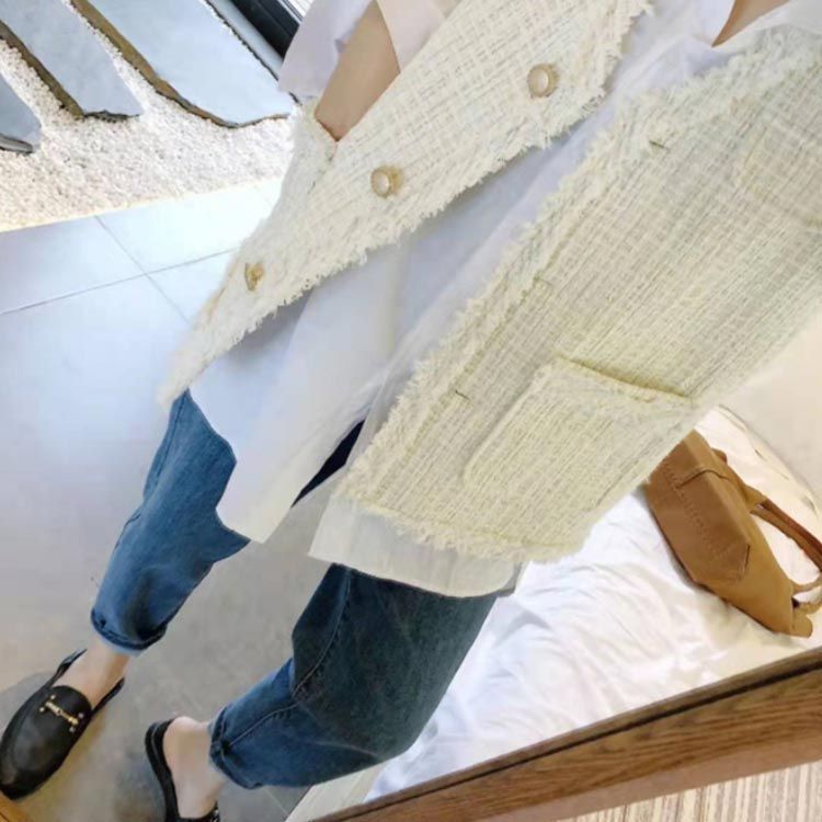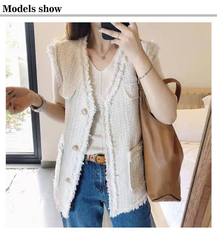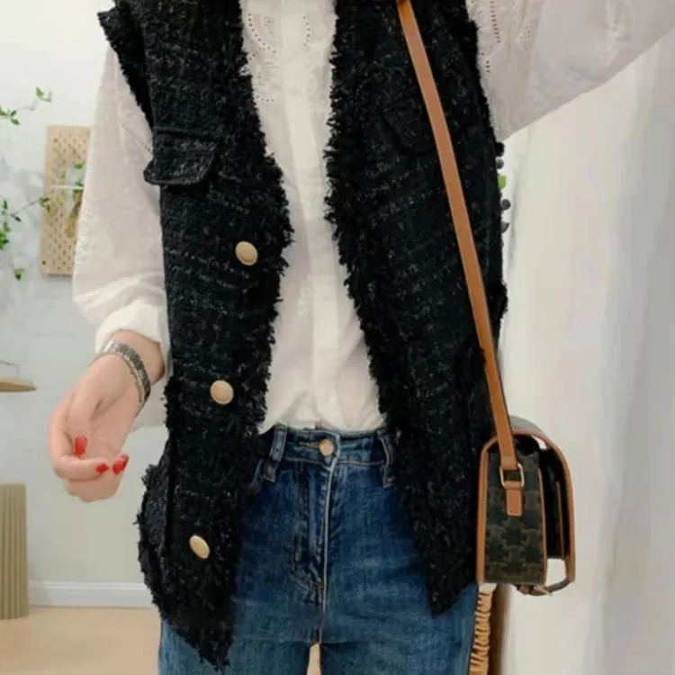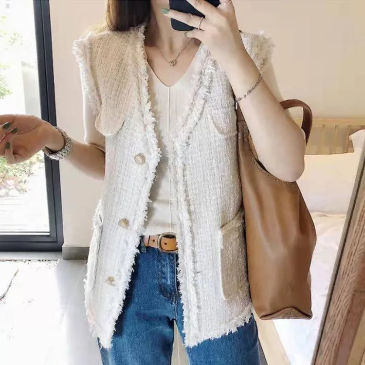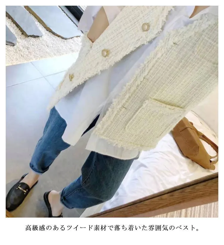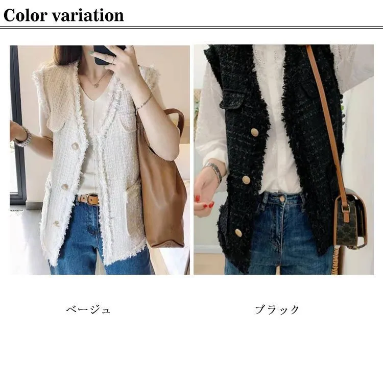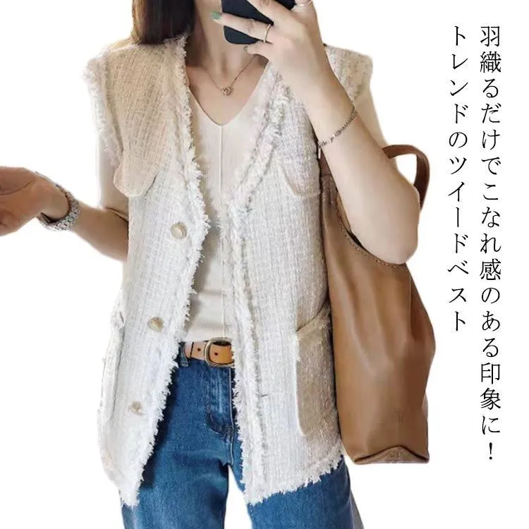 フリンジ ツイード ツイード レディース Vネック ジャケット ジレ ノーカラー ミドル丈 きれいめ アウター お出かけ レイヤード 上品 秋 冬 フリンジ ボタン おしゃれ 韓国ファッショ フォーマ#kitsu595340