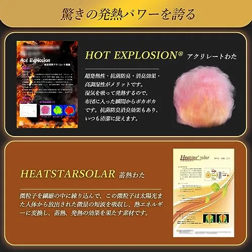 【HEATSTARsolar蓄熱わた】Heatstar-solarは微粒子酸化物を繊維の中に練り込んで、この微粒子酸化物は太陽光また人体から放出された微量の短波を吸収し、熱エネルギーに変換し、自ら蓄熱、発熱の効果を果たす素材です。