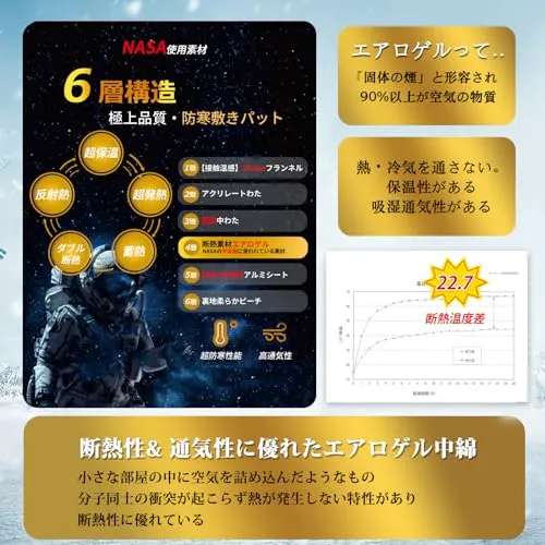 【NASAの宇宙服に使われる断熱素材】この敷きパッドが使用している『エアロゲルシート』は、NASAが宇宙空間でも断熱材として採用され、広く知られたシリカエアロゲルをさらに改良し、当社の研究所と有名な大学が研究して、独自加工した特殊生地です、断熱性に優れ、外部からの冷気を遮り、内部の熱を逃がしにくいのは魅力です。
