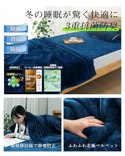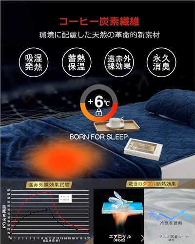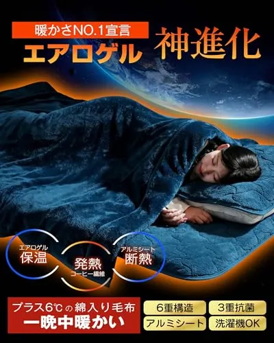 『アルミ蒸着シートを含む6重保温』研究に研究を重ね、こだわりぬいた独自の6重特殊構造により、暖房いらずで朝までポカポカの2枚合わせ毛布/厚手毛布。表層と裏層にも触り心地がふわふわの温熱北極絨生地を使用。 中層には「冷気遮断」機能を持つアルミコーティングされた熱反射層、「断熱」エアロゲルわた、「遠赤外発熱」コーヒー炭素わた、高機能抗菌防臭防ダニ繊維を採用。包まれるようなあたたかさで"至福の眠り"を提供する、贅沢な構造とやさしい温熱効果です。