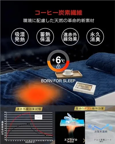 『2つの最先端テクノロジーで誕生、未来のあったか毛布』「21世紀に革命を起こす素材」として知られる「エアロゲル」は、宇宙服にも使用されている圧倒的な「断熱性」「軽量性」「通気性」「柔軟性」「耐久性」を誇る素材です。また、「次世代の夢のような素材」と称されるコーヒーファイバーは、天然の「吸湿発熱」「蓄熱保温」「遠赤外発熱」「永久消臭」の特性を持ち、環境にもやさしい素材です。これら2つの最先端素材を「毛布 冬用」に使用し、究極の暖かさと快適さを実現しました。私たちにとっては小さな一歩かもしれませんが、寝具(エアロゲル毛布)の世界にとっては大きな前進だと確信しています。ぜひ、"極みの一枚"を体験してみてください。