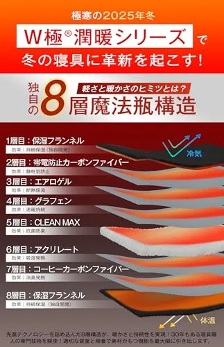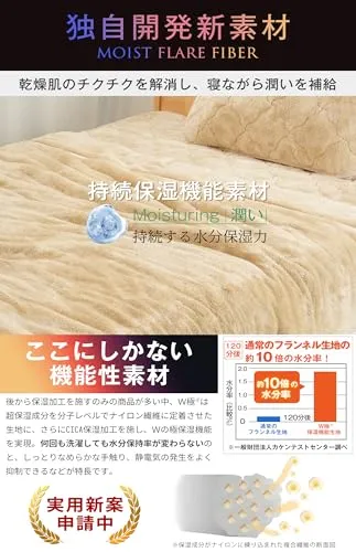 【暖かいだけじゃない!潤暖毛布】冬の「暖かさ」だけでなく「肌の潤い」も求めるなら、このW極モイストフレア潤暖寝具で、乾燥や冷えによる肌の悩みを一掃し、6つの先端テクノロジーが届ける「潤いあふれる暖かさ」を体感してください。独自に開発した業界初となる「持続する水分保持フランネル機能生地」が、独自の技術で超保湿成分を分子レベルでナイロン繊維に定着させ、肌に薄い「潤いの膜」をかけるような奢らかな体感をお届けします。さらに CICA 保湿加工を施すことで、ダブルの保湿効果で、肌が毛布に触れる瞬間から、スキンケア成分が肌をしっかり保護し、自生の潤いを逃がさないようキープ。柔らかさが肌に密着するように寄り添い、寝ている間に自然に潤いを補給してくれるため、冬の乾燥によるチクチク感が一掃されます。冬の二大敵「冷え」と「乾燥」、潤暖冬用毛布一つで完璧対策!