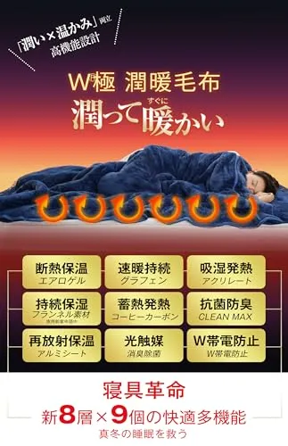 【6つのテクノを集結した、薄くて軽いのに暖かい高機能毛布】宇宙服断熱素材「エアロゲル」と、ノーベル賞受賞「グラフェン」を黄金配合したこの冬用毛布は ??熱をしっかり閉じ込めつつ、外の寒気を一気に遮断。さらに遠赤外線を放射して迅速に発熱し、体の芯までじんわりと温めます。触れたその瞬間暖かさが肌に届き、「冷たい不安」が一瞬で和らぎます。さらに吸湿発熱のトップ級素材「アクリレート」を導入:ウールの2.5倍の発熱力で、体の湿気をすぐ熱に変え、一晩中足元までポカポカ。抜群な