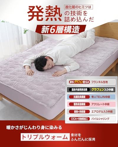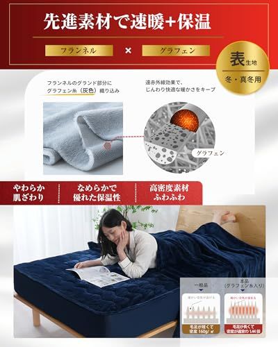 【ボックスシーツ 冬新6層構造:進化の保温力で即寝落ち】 熱力学に基づいた新6層構造で暖かさを徹底最適化: 表層:グラフェン練り込み高密度フランネル(発熱層)。 W発熱層:グラフェン入り中綿発熱層帝人中綿抗菌防臭層。 W蓄熱層:アクリレート中綿蓄熱層エアロゲル断熱層。 裏層:ポリエステルパイルシャーリング(通年使用層)。 進化した構造のあったかボックスシーツが、寝ている間に、発熱・蓄熱・保温・断熱が繰り返されるため、それぞれの機能を重ね合わせることで持続的な保温効果を実現しています。