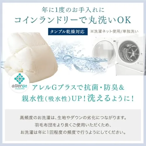【コインランドリーで洗濯・乾燥OK】(洗濯ネット使用) ※製品に付属している品質表示には「洗濯不可」と表記されていますが、こちらはご家庭での取り扱いの場合になります。 ※コインランドリーでのお洗濯・タンブル乾燥が可能です。洗濯・乾燥の際は必ずネットを使用し、単独洗いを行ってください。 ※洗濯後、乾燥が十分でないとにおいが発生する場合があります。生乾きの場合追加で乾燥をかけてください。 ※洗濯機の容量が足りないと生地を痛める場合があります。洗濯機のサイズは少しゆとりのあるものをお選びください。 ※乾燥機から出した直後は、羽毛のにおいが強く感じられます。これは高温・多湿で油分が溶け出しにおいが強まる羽毛の素材特性になります。しっかりと乾燥させ冷ます事で軽減しますのでご安心ください。 ※高頻度のお洗濯は、生地やダウンの劣化につながります。羽毛布団をより長くご使用いただくため、お洗濯は年に1回程度の頻度で行うようにしてください。 ※羽毛の産地は東アジア(台湾・中国等)です。 ※2024年8月20日よりグレーを追加しました。 ※2025年11月17日より側地が防ダニ生地に変更となりました。 Q. 羽毛布団のにおいが気になります