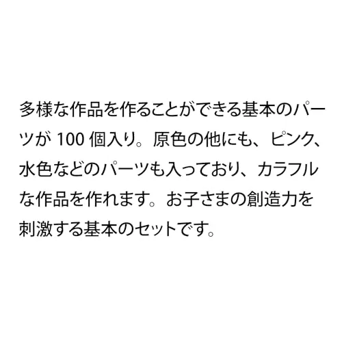 多様な作品を作ることができるベーシックな色と形のパーツが100個入っています。はじめての購入にも、買い足しにもおすすめです。