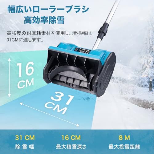 【電動式雪かき機】当社のコードレス雪かきは使いやすい。 バッテリーをつなぐだけで、すぐに使えます。電動除雪機はハイパワー無刷モーターを搭載し、幅31cm、深さ16cmの雪道を簡単に除去します。毎分大120kgの雪を処理し、大8mの投雪距離を実現。家庭用から業務用まで対応するパワフル性能で、あらゆる積雪状況に素早く対応します。