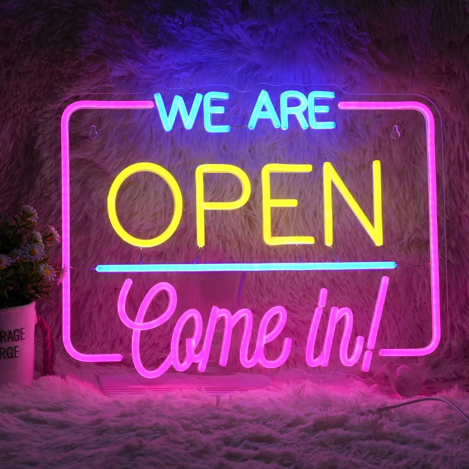 We Are Open Come Inネオンサイン 調光 オープンネオン壁装飾 16.9*13インチ 発光ネオンライト USB給電 商業店オープンネオン看板 ホテル レストラン バー装飾灯(ピンクイエローブルー)