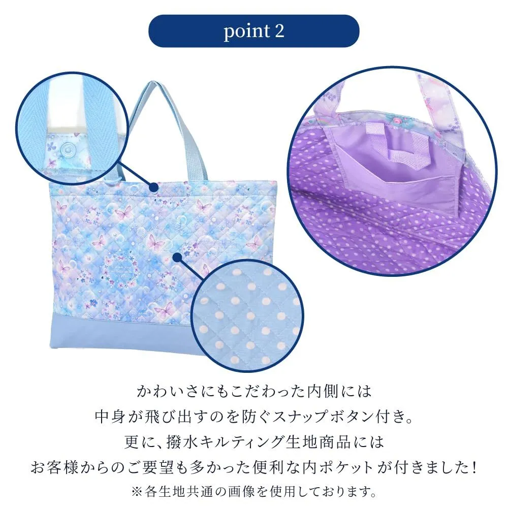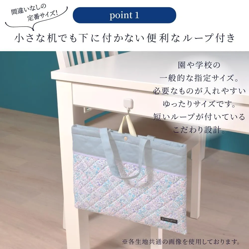 小学校・幼稚園・保育園からの一般的な指定サイズ30×40cm。大判の絵本やスケッチブックなどがすっぽり入る定番サイズ。名札を付けるDカンも付属しています。持ち手はお子様の手にも持ちやすいテープ仕様。