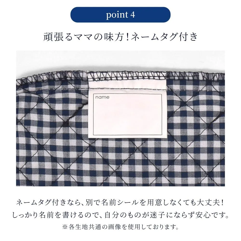 スナップボタン&ネームタグ付き。袋口のスナップボタンを留めることで、中身が飛び出しにくく安心。プライバシーに配慮し、ネームタグは内側に付いております。