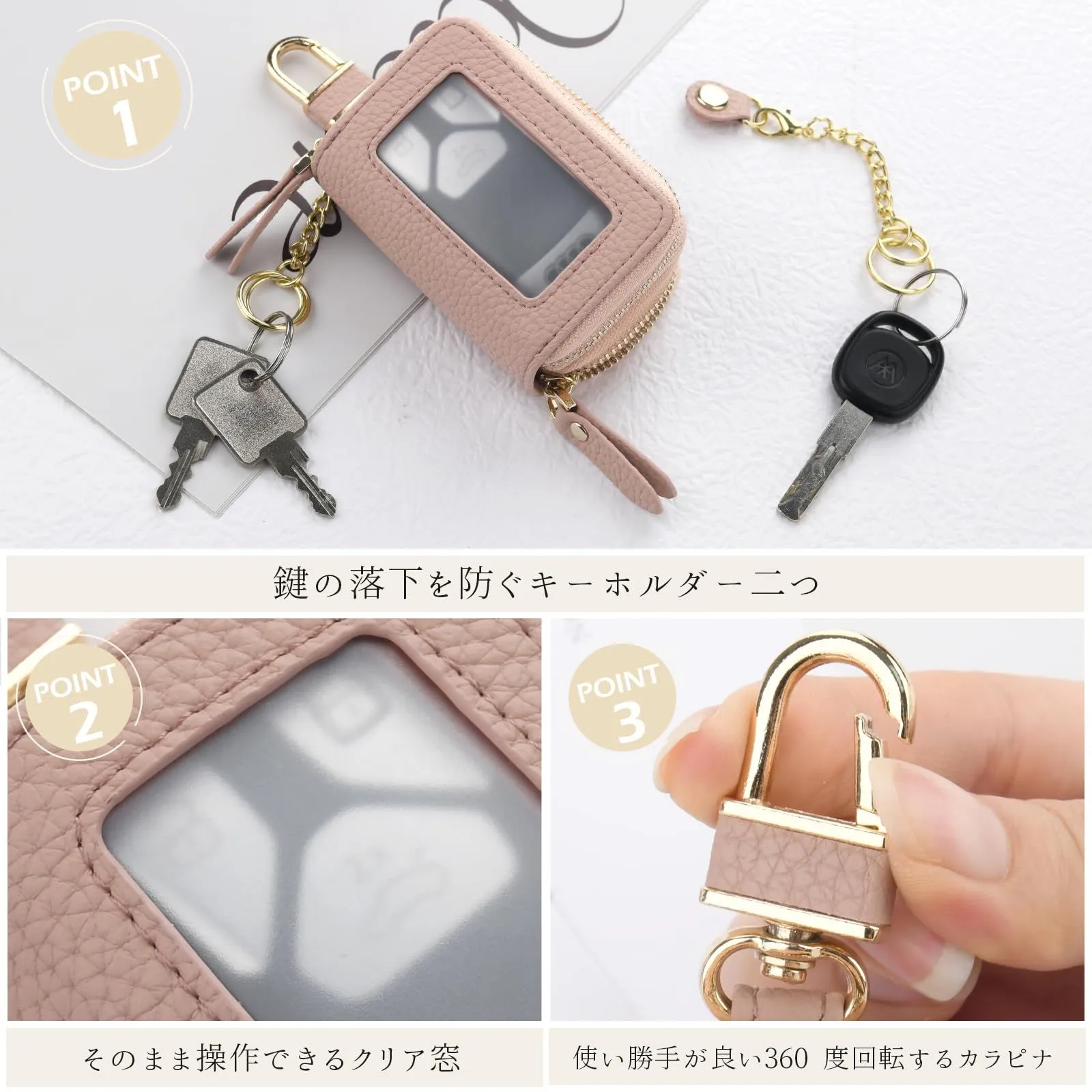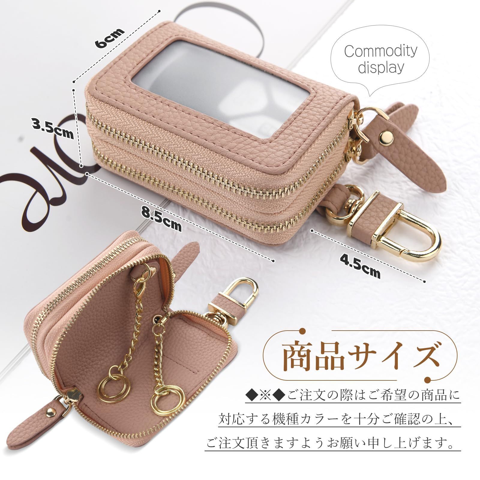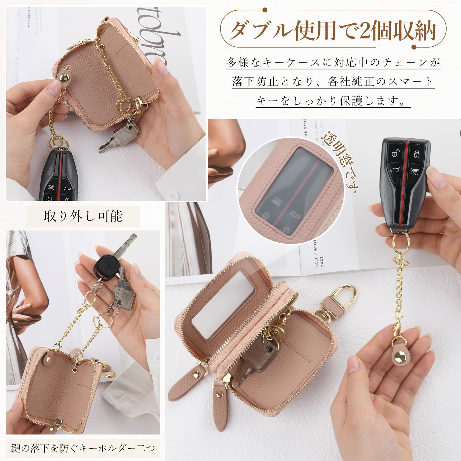[Chillchi] スマートキーケース 2個収納 レディース メンズ 革 窓付き 車 カバー カラビナ付き クリア窓 ダブル スマートキーケース ファスナー 鍵 ダブルポケット ダブルファスナー
