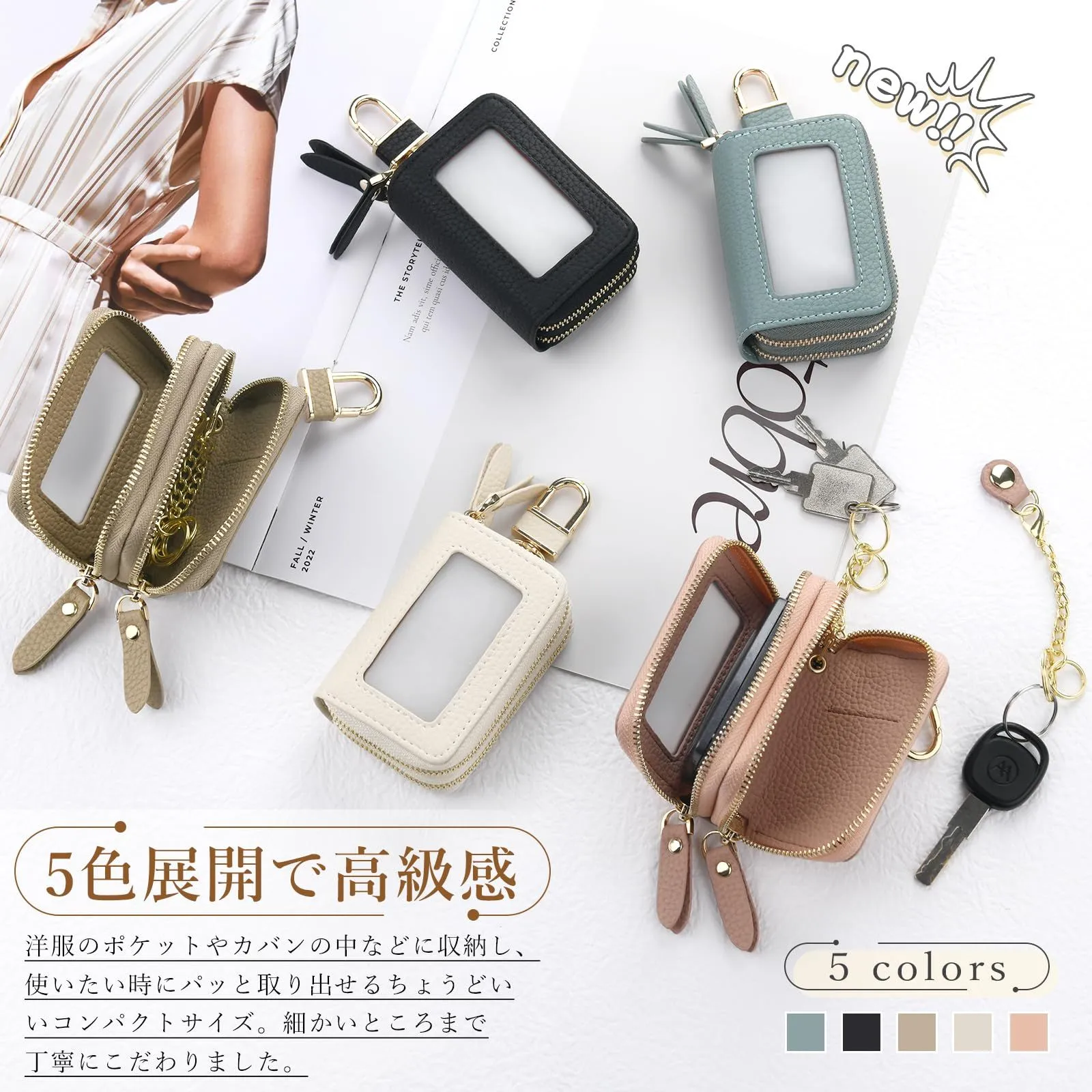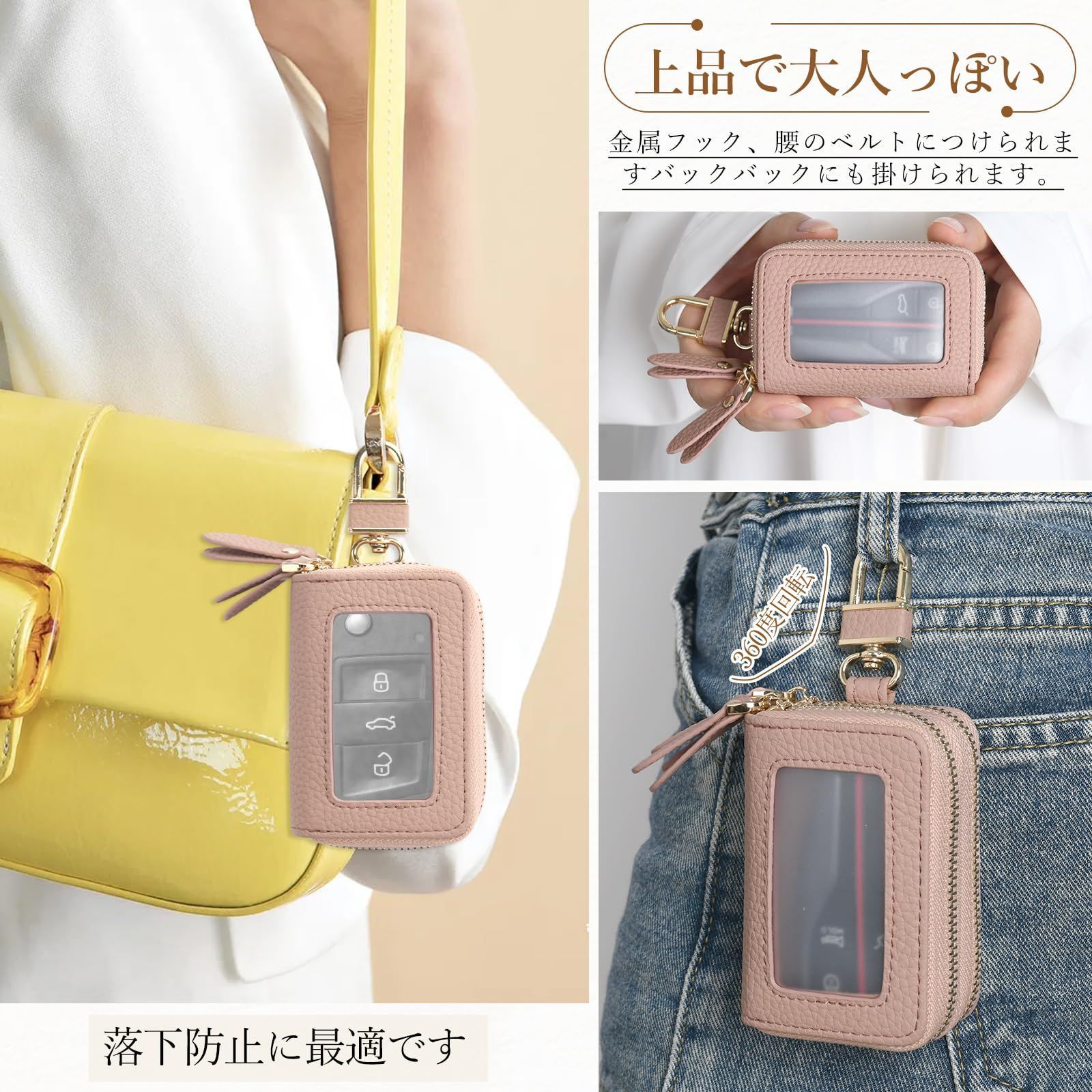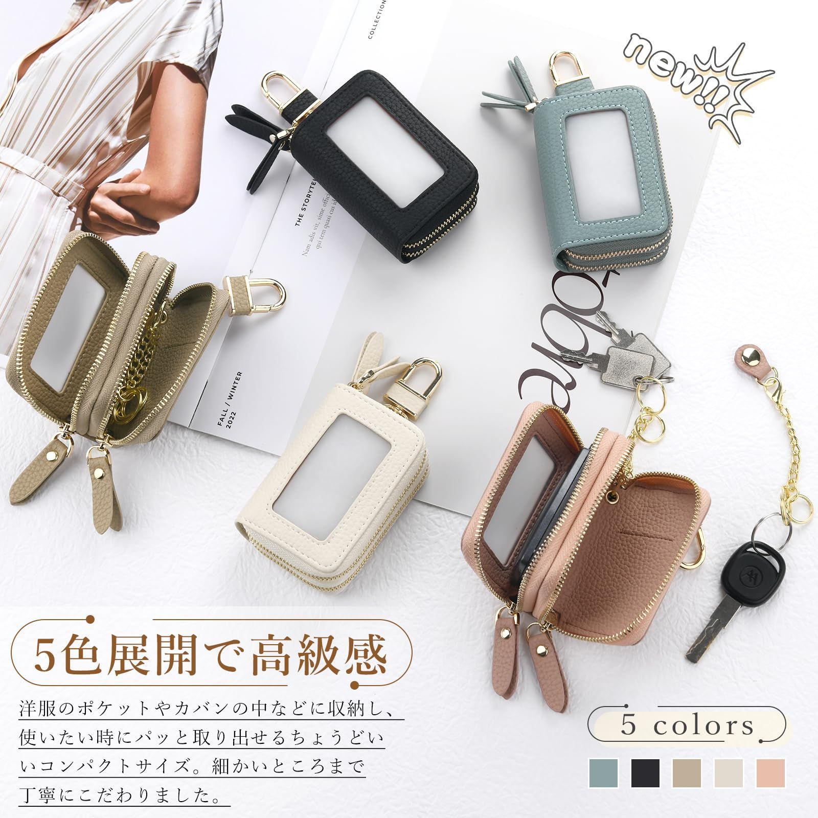 [Chillchi] スマートキーケース 2個収納 レディース メンズ 革 窓付き 車 カバー カラビナ付き クリア窓 ダブル スマートキーケース ファスナー 鍵 ダブルポケット ダブルファスナー