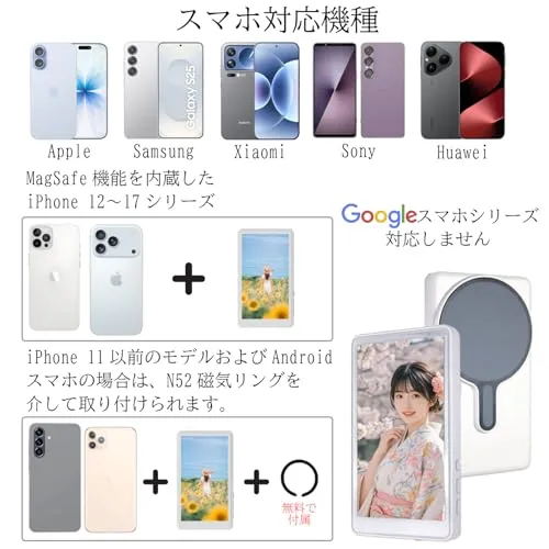 【強力マグネット吸着!iPhone 12-17 MagSafe対応&全スマホ安心設計】iPhone 12-17 (MagSafe対応機種) なら、ケースごと背面にピタッと磁石吸着です!MagSafe非対応機種には付属のマグネットリングをスマホに貼るだけで、同様の強力吸着力を発揮します。スマホ背面への装着が非常に簡単で安定、落下の心配も軽減します。