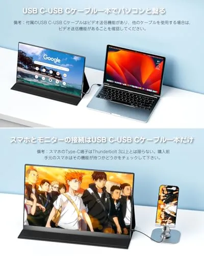 【新品未使用】 「1080Pモバイルディスプレイ」Yodoitの1080PフルHDポータブルモニターは高品質な画質を持ち、IPSパネルは 178の全視野角度と鮮やかな色の再現をサポートします。 重さ0.7 kg、厚さ0.9 cm、ポータブルラップトップモニターは軽量で、持ち運び便利です。出張や旅行によい伴侶と思います。 「プラグアンドプレイ」ドライバーのインストールは不要で、付属のUSB Type-CまたはミニHDMIケーブルを使用してポータブルラップトップモニターをデバイスに接続するだけで、仕事や再生を開始できます。 外出先で仕事をしているときも、友達とゲームをしているときも、お気に入りの番組を見ているときも、このポータブルモニターは完璧なソリューションです。ご注意:Switch2は暫く使用出来ません。 「幅広い互換性」モバイルディスプレイはサブディスプレイとして機能し、効率を向上させることができます。ラップトップ、PC、Mac、スマートフォン、PS4/PS5、XBOX、Switchなどと幅広く互換性があり、ビジネス、旅行、エンターテイメントに最適です。携帯電話を使用する場合、全機能Type Cポートなスマホが必要なので、ご注意下さいませ。 「HDR&アイケア」ハイダイナミックレンジ(HDR)テクノロジーにより、高いレベルのコントラストと明るさを提供します。このポータブルモニターには、目の疲労を軽減する低ブルーライト技術も搭載されています。長時間を使用しても、目に対しての刺激はやさしいです。仕事、会議、ゲーミング、サブモニター等のシーンに大活躍できます。VESA対応でき、ポートレートモードが利用可能となります。M34mmネジを使用してください。ネジを打ち込む時、力を入れすぎないように、力を入れすぎると画面本体を破壊する可能性があり、呉呉も注意してください。また、絶対に電動ドライバーなどでは締め付けないようご注意下さい。 「デュアルスピーカーとスタンドカバー」2つのスピーカーが内蔵されており、保護ケースとしても使える丈夫なスタンドカバーが付属しています。カバーはユニークな折りたたみデザインを採用しており、使用しないと 6b1455fb