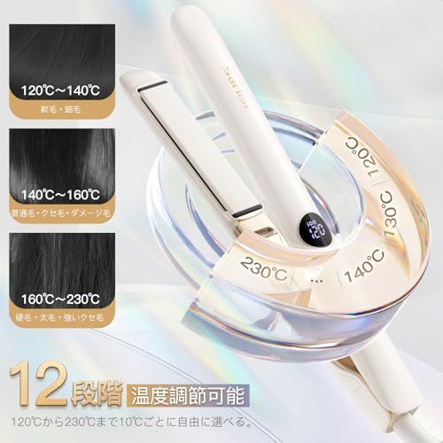 【MAX23015Sで急速立ち上げ&12段階温度調節可能】毎朝、欲しいのは速度や効果。スピーティーな昇温を実現できるハイパワーMCHヒーターを搭載し、たった15秒だけで160まで達し、25秒で200まで到達でき、時短なスタイリングを実現!クセ毛・うねり・パサつきなどにも対応可能で、サラつや感いっぱい髪を気軽に仕上げます。また、LCDパネルに温度が表示されて、120-230まで12段階(10間隔)の温度調節が可能なプロ仕様、髪質やスタイリングに合わせてお選びいただけます。髪質に合わせてオススメの温度:硬毛・太毛・強いクセ毛160-230、普通毛・クセ毛・ダメージ毛140-160、軟毛・細毛120-140。