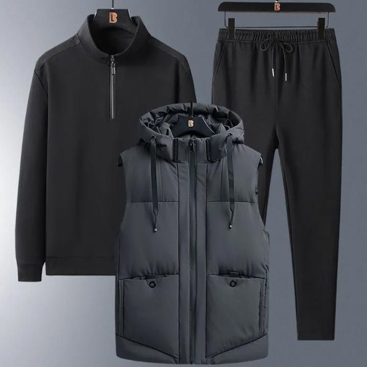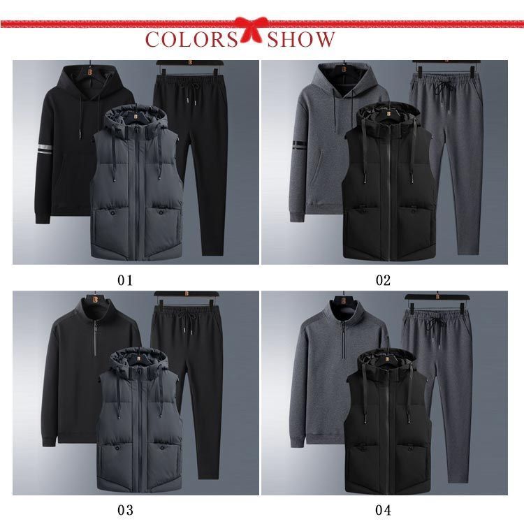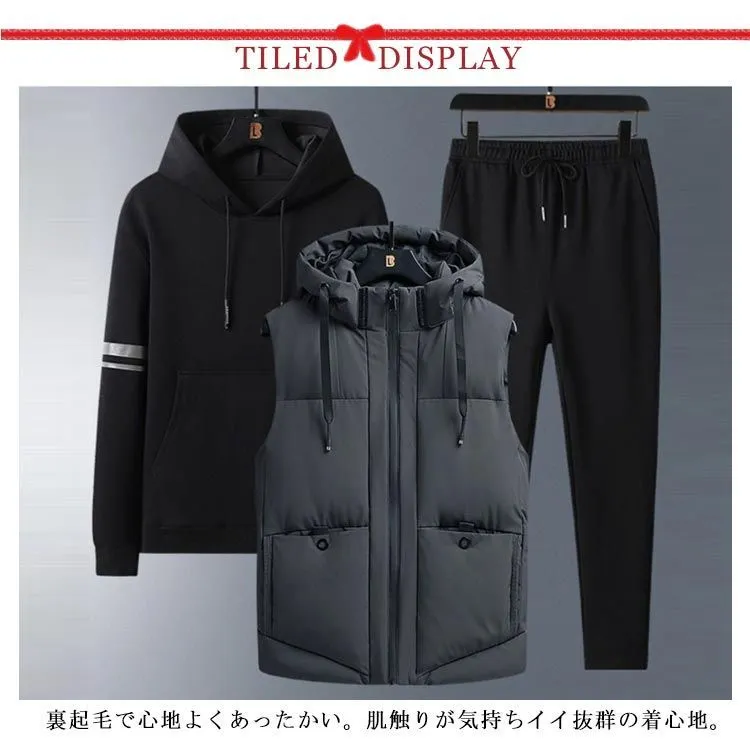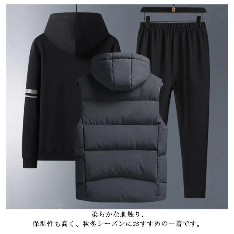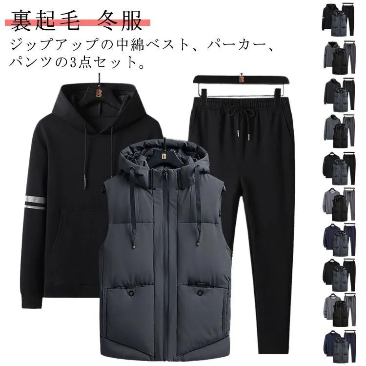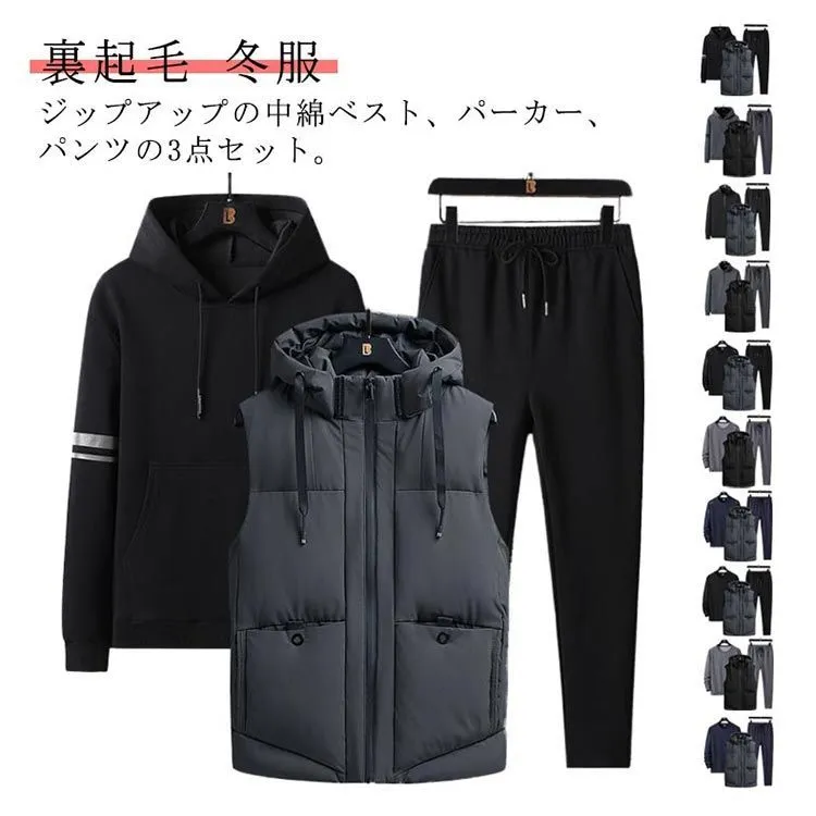 長袖 パーカー 部屋着 3点セット プルオーバー ジップアップ 冬服 スウェット 冬 カジュアル 裏起毛 上下セット 中綿ベスト 防寒 メンズ 暖かい フード付き ルームウェア 普段着 セットアップ#cjfj136933