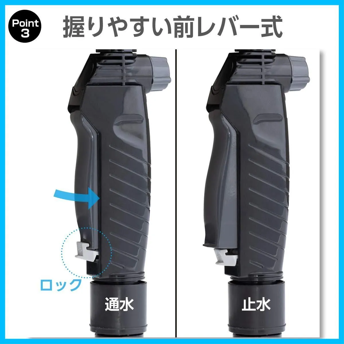 ●通止水の切替は握りやすい前レバー式。