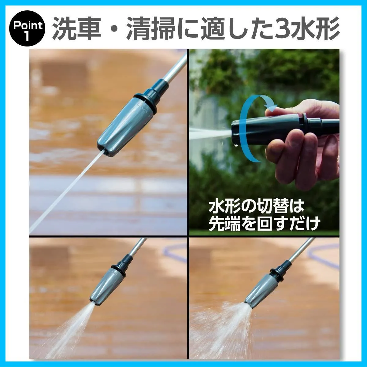 ●洗車・清掃に適した3水形ジェット・ワイド・レイン)勢い重視から範囲重視まで、様々なシチュエーションに対応。