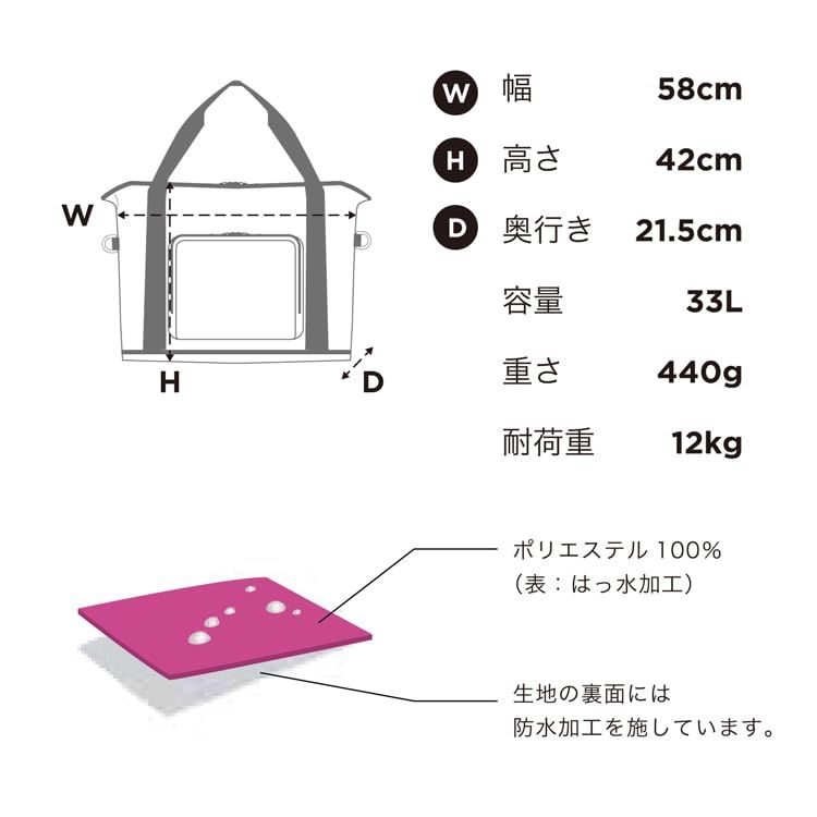 はっ水加工を施しているので汚れがつきにくい容量33L耐荷重12kgパッカブル/コンパクト収納・底に収納スペースキャリーケースのハンドル部分の幅に合わせられる横ずれ防止ベルト付き