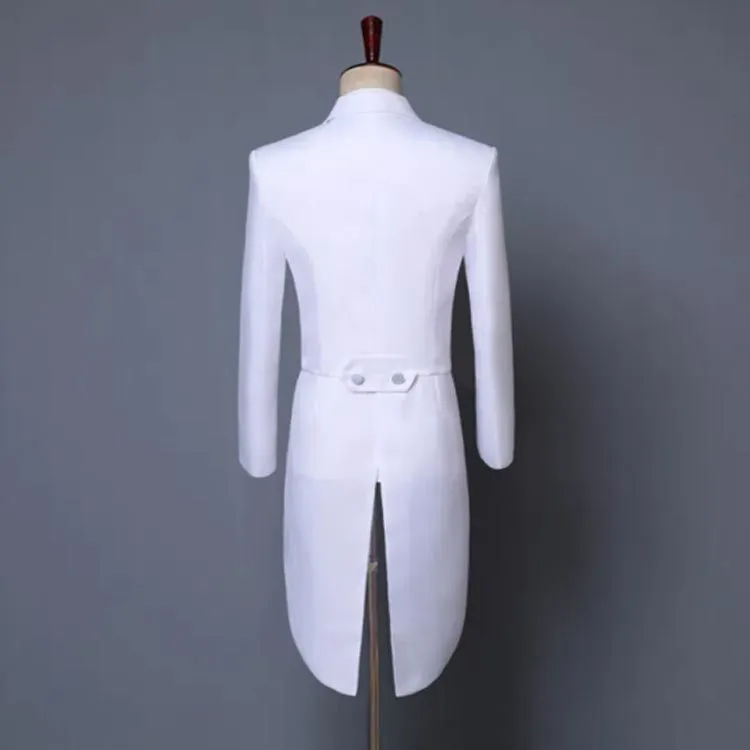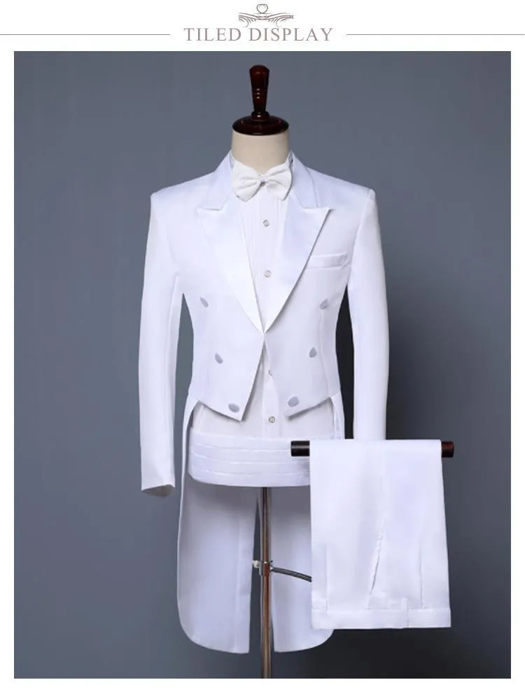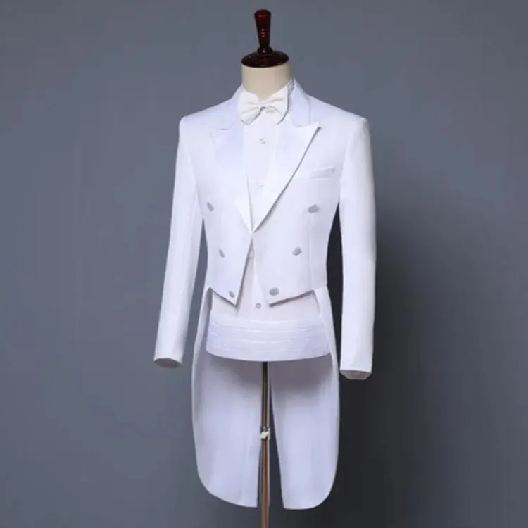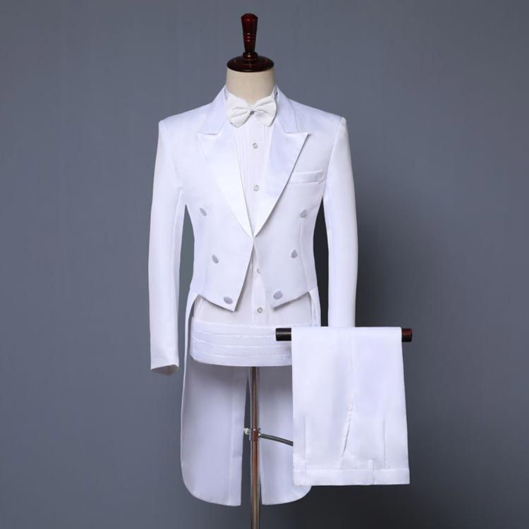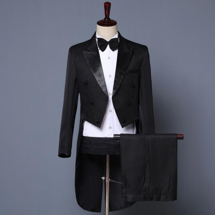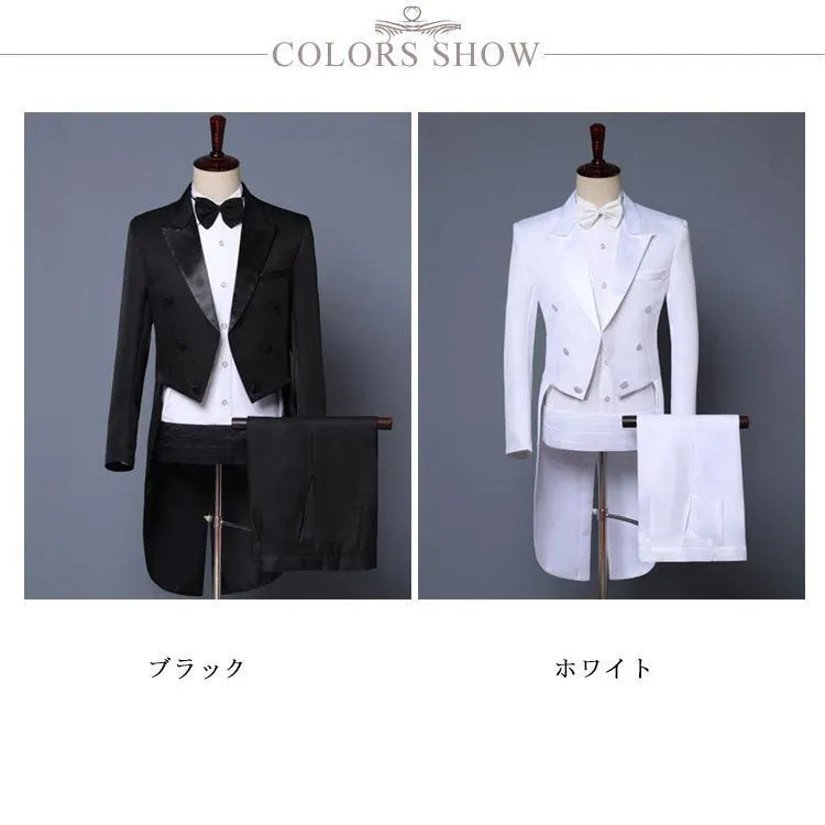 燕尾ジャケット&長ズボン&蝶タイ&カマーバンドの4点セット。
